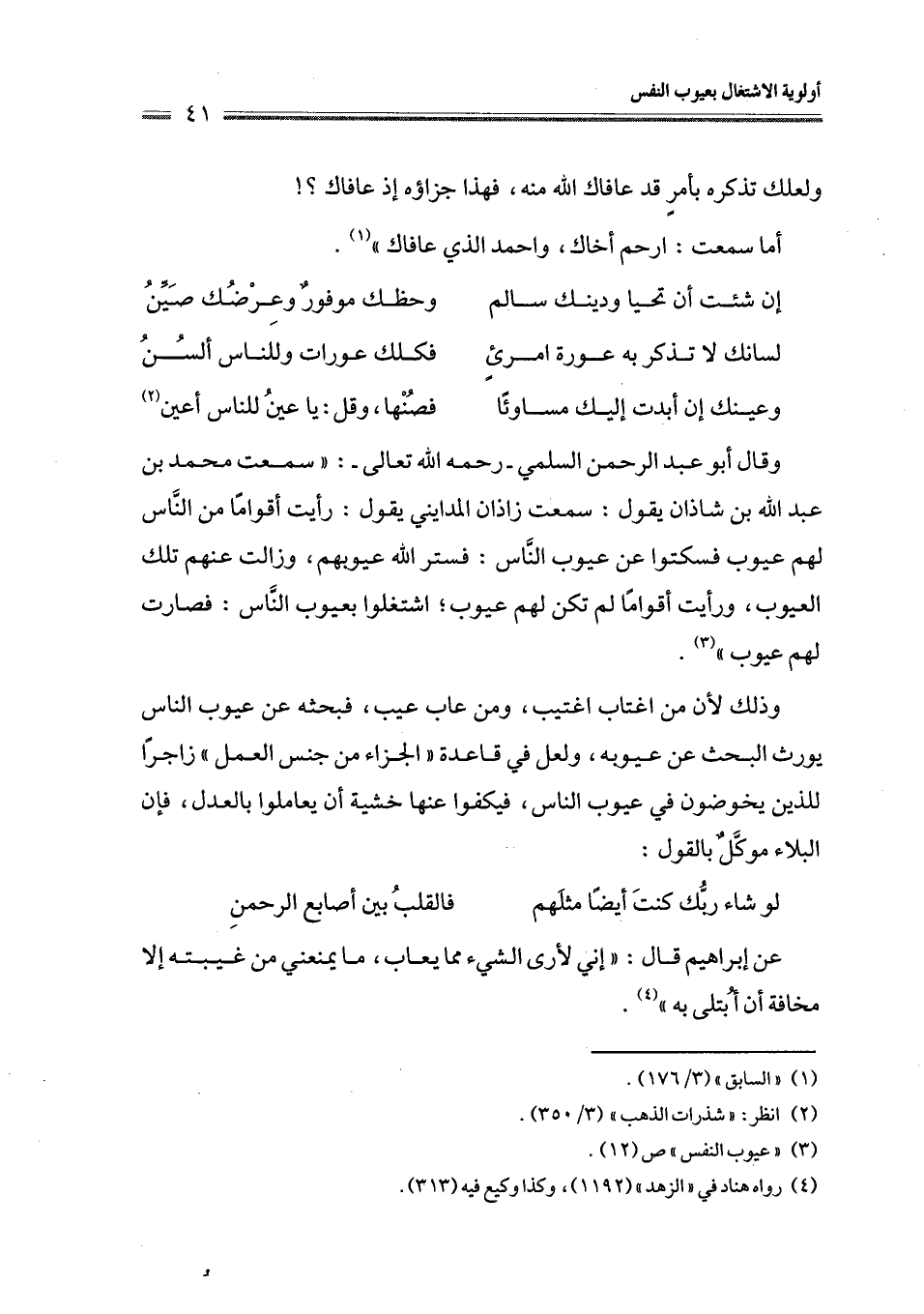 وقال أبو عبد الرحمن السلمي -رحمه الله تعالى-: " سمعت محمد بن عبد الله بن شاذان يقول: سمعت زاذان المدايني يقول: رأيت أقوامًا من النَّاس لهم عيوب فسكتوا عن عيوب النَّاس: فستر الله عيوبهم، وزالت عنهم تلك العيوب، ورأيت أقوامًا لم تكن لهم عيوب؛ اشتغلوا بعيوب النَّاس: فصارت لهم عيوب " (¬3).