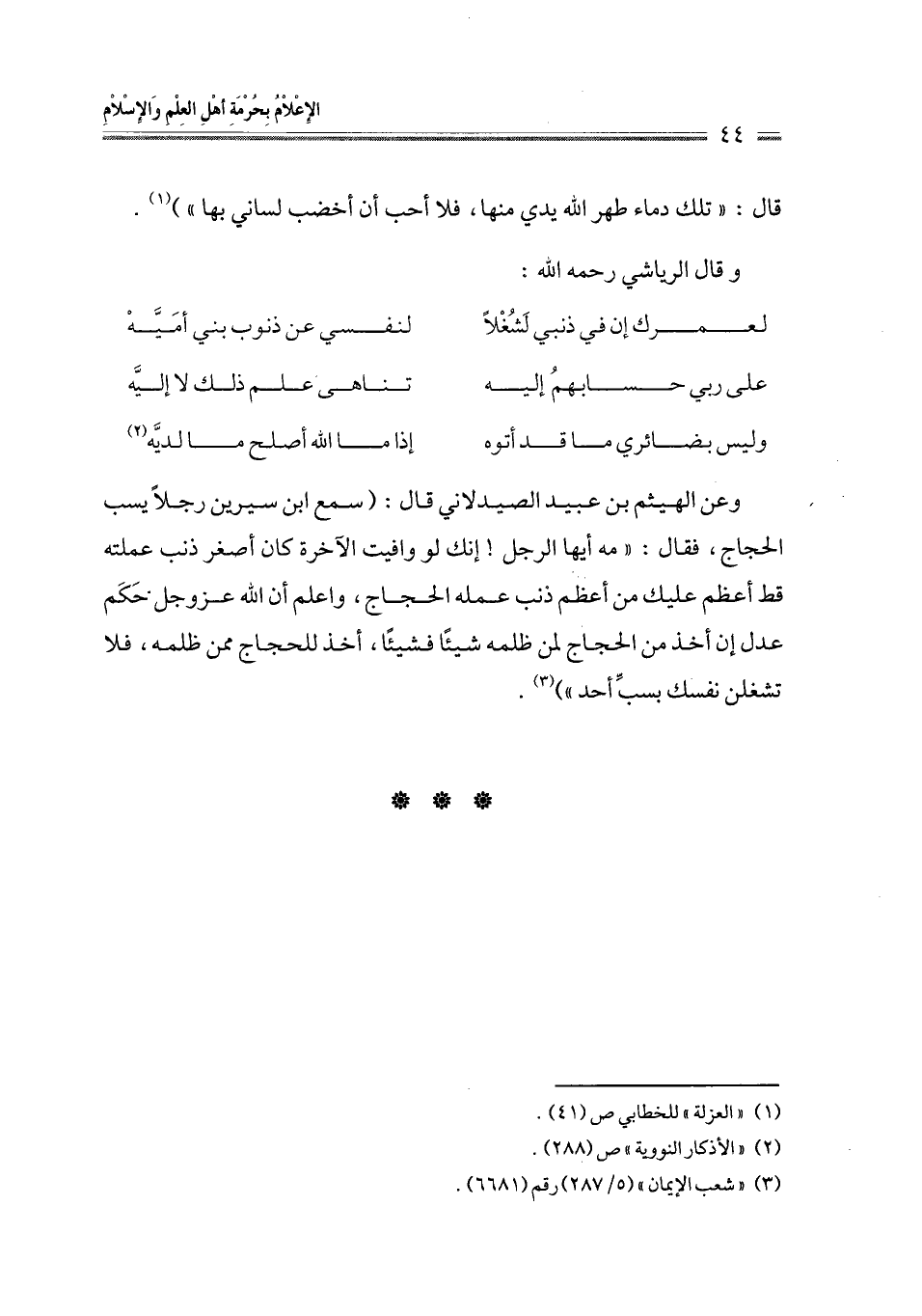 وعن الهيثم بن عبيد الصيدلاني قال: (سمع ابن سيرين رجلاً يسب الحجاج، فقال: " مه أيها الرجل! إنك لو وافيت الآخرة كان أصغر ذنب عملته قط أعظم عليك من أعظم ذنب عمله الحجاج، واعلم أن الله عز وجل حَكَم عدل إن أخذ من الحجاج لمن ظلمه شيئاً فشيئًا، أخذ للحجاج ممن ظلمه، فلا تشغلن نفسك بسبِّ أحد ") (¬3).