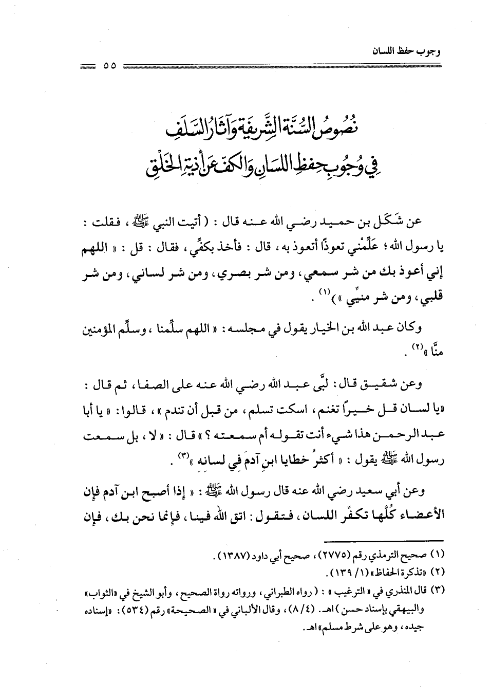 وعن شقيق قال: لبَّى عبد الله رضي الله عنه على الصفا، ثم قال: " يا لسان قل خيرًا تغنم، اسكت تسلم، من قبل أن تندم "، قالوا: " يا أبا عبد الرحمن هذا شيء أنت تقوله أم سمعته؟ " قال: " لا، بل سمعت رسول الله - صلى الله عليه وسلم - يقول: " أكثر خطايا ابنِ آدمَ فِي لسانِهِ " (¬3).