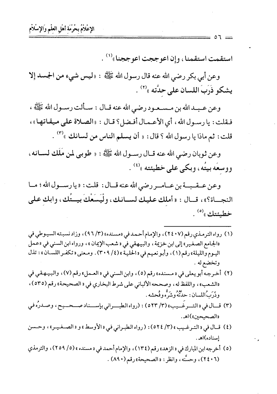 (¬1) رواه الترمذي رقم (2407)، والإمام أحمد في " مسنده " (3/ 96)، وزاد نسبته السيوطي في " الجامع الصغير " إلى ابن خزيمة، والبيهقي في " شعب الإيمان "، ورواه ابن السني في " عمل اليوم والليلة " رقم (1)، وأبو نعيم في " الحلية " (4/ 309). ومعنى " تكفر اللسان ": تذل وتخضع له.