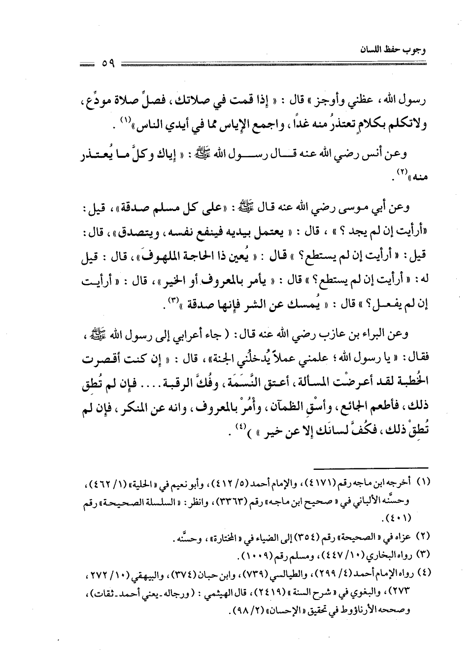 وعن البراء بن عازب رضي الله عنه قال: (جاء أعرابي إلى رسول الله - صلى الله عليه وسلم -، فقال: " يا رسول الله؛ علمني عملاً يُدخلُني الجنة "، قال: " إِن كنت أقصرت الخُطبة لقد أعرضْت المسألة، أعتق النَّسَمَة، وفُكَّ الرقبة .... فإِن لم تطِق ذلك، فأطعم الجائع، وأسْقِ الظمآن، وأْمُرْ بالمعروف، وانه عن المنكر، فإِن لم تُطِقْ ذلك، فكُفَّ لسانَك إِلا عن خير ") (¬4).