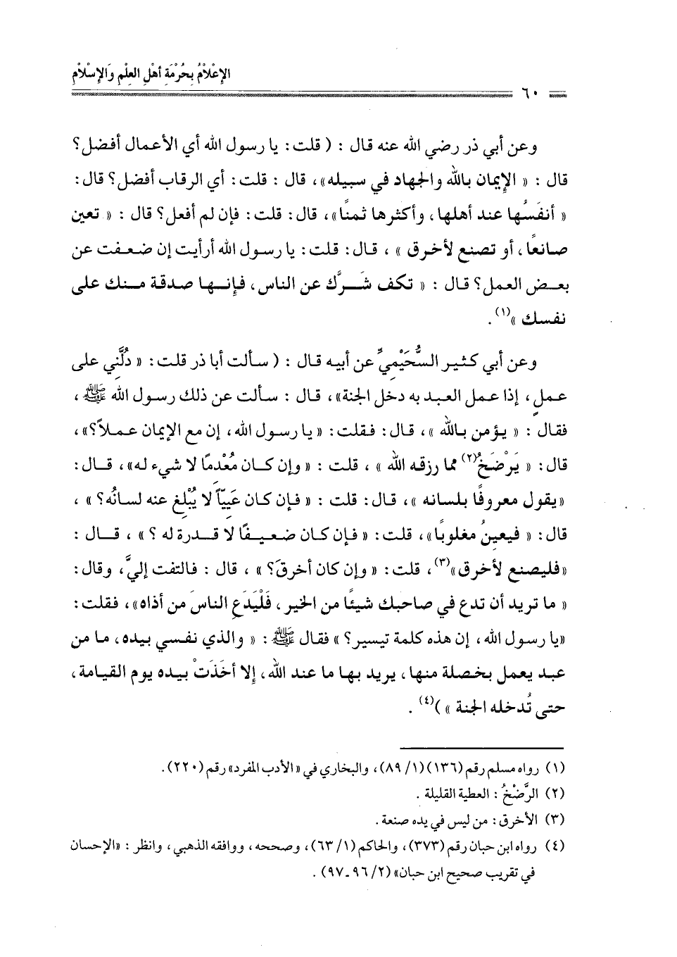 وعن أبي كثير السُّحَيْمِيّ عن أبيه قال: (سألت أبا ذر قلت: " دُلَّني على عملٍ، إذا عمل العبد به دخل الجنة "، قال: سألت عن ذلك رسول الله - صلى الله عليه وسلم -، فقال: " يؤمن بالله "، قال: فقلت: " يا رسول الله، إن مع الإيمان عملاً؟ "، قال: " يَرْضَخ (¬2) مما رزق الله "، قلت: " وإن كان مُعْدمًا لا شيء له "، قال: " يقول معروفًا بلسانه "، قال: قلت: " فإن كان عَيياً لا يُبْلِغ عنه لسانُه؟ "، قال: " فيعيِنُ مغلوبًا "، قلت: " فإن كان ضعيفًا لا قدرة له؟ "، قال: " فليصنع لأخرق " (¬3)، قلت: " وإن كان أخرقَ؟ "، قال: فالتفت إليَّ، وقال: " ما تريد أن تدع في صاحبك شيئًا من الخير، فَلْيَدَع الناسَ من أذاه "، فقلت: " يا رسول الله، إن هذه كلمة تيسير؟ " فقال - صلى الله عليه وسلم -: " والذي نفسي بيده، ما من عبد يعمل بخصلة منها، يريد بها ما عند الله، إِلا أخَذَتْ بيده يوم القيامة، حتى تُدخله الجنة ") (¬4).