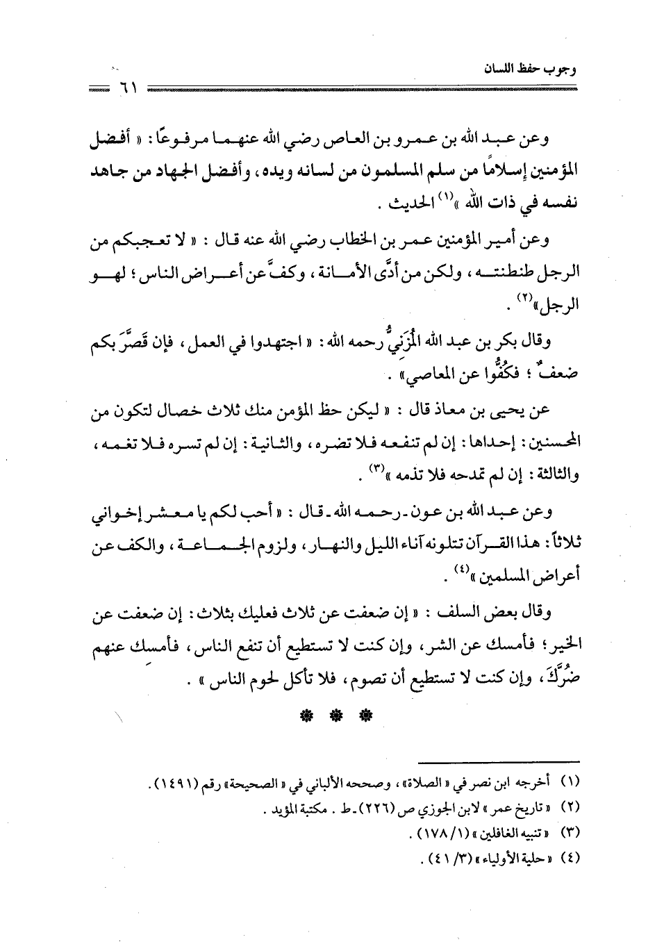 وعن عبد الله بن عون -رحمه الله- قال: " أحب لكم يا معشر إخواني ثلاثًا: هذا القرآن تتلونه آناء الليل والنهار، ولزوم الجماعة، والكف عن أعراض المسلمين " (¬4).