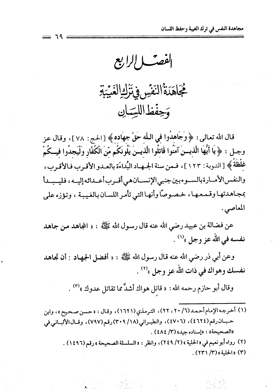 عن فضالة بن عبيد رضي الله عنه قال رسول الله - صلى الله عليه وسلم - " المجاهد من جاهد نفسه في الله عز وجل " (¬1).