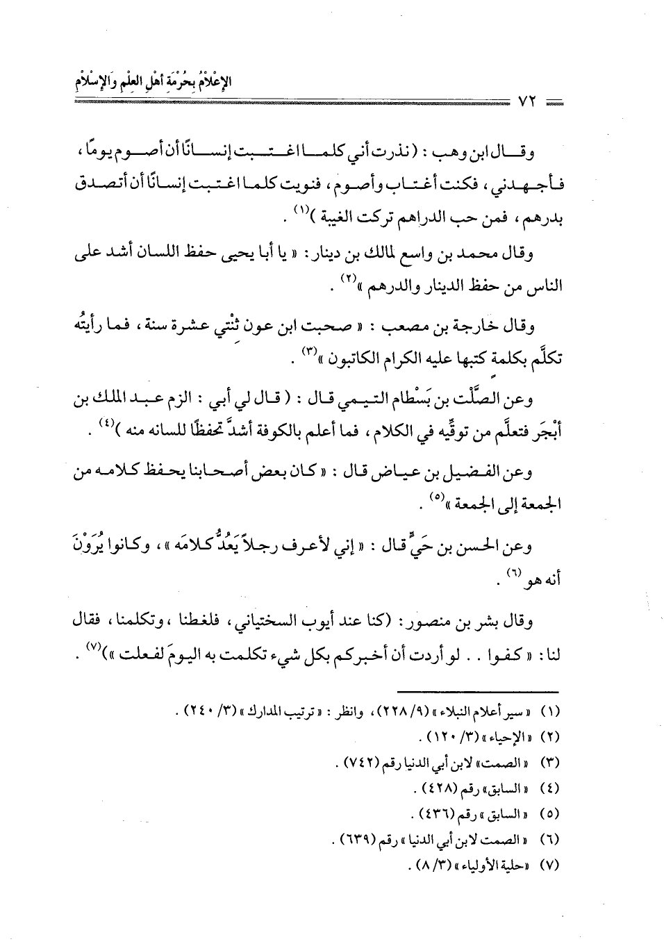وعن الفضيل بن عياض قال: " كان بعض أصحابنا يحفظ كلامه من الجمعة إلى الجمعة " (¬5).