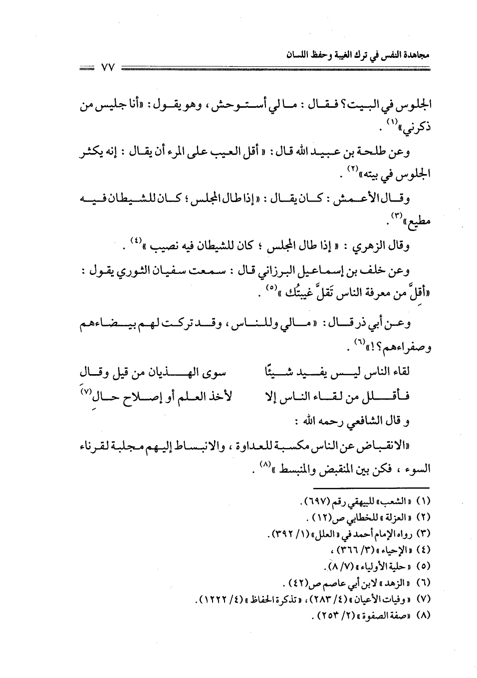 فأقلل من لقاء الناس إلا ... لأخذ العلم أو إصلاح حالِ (¬7)