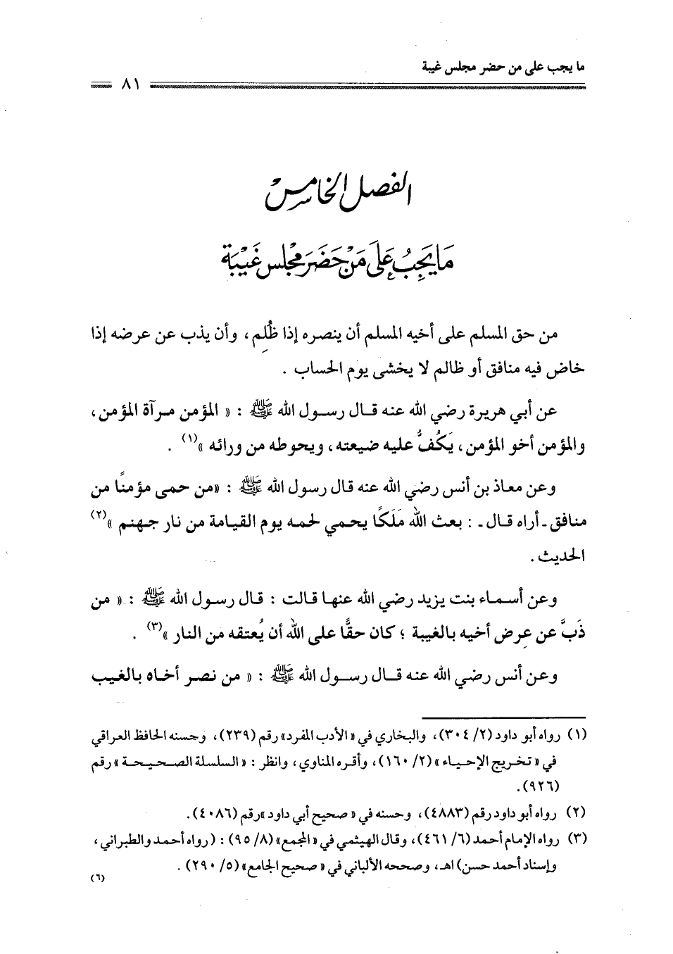 وعن معاذ بن أنس رضي الله عنه قال رسول الله - صلى الله عليه وسلم -: " من حمى مؤمنًا من منافق -أراه قال-: بعث الله مَلَكًا يحمي لحمه يوم القيامة من نار جهنم " (¬2). الحديث.