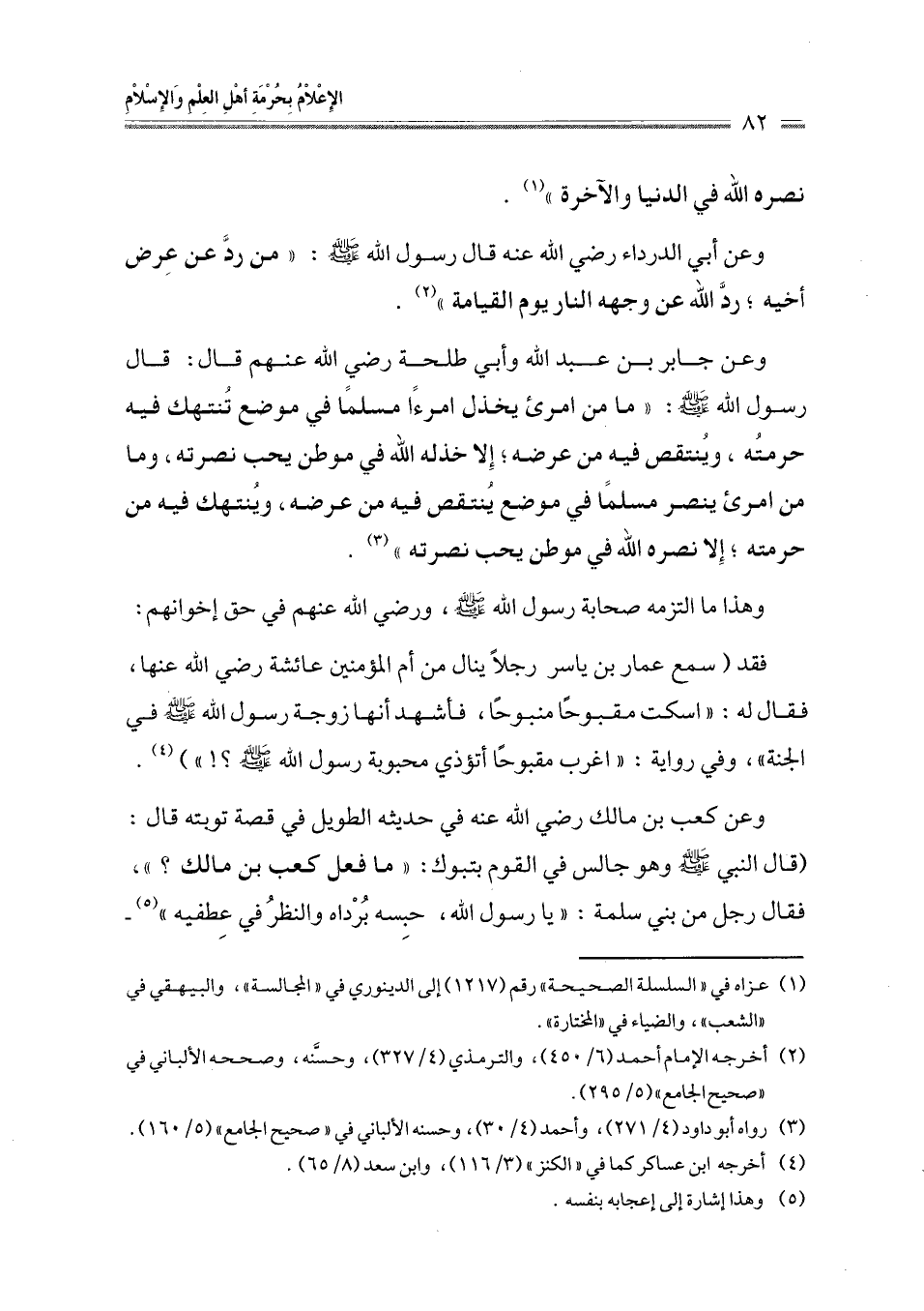 وعن جابر بن عبد الله وأبي طلحة رضي الله عنهم قال: قال رسول الله - صلى الله عليه وسلم -: " ما من امريء يخذل امرءًا مسلمًا في موضع تُنتهك فيه حرمتُه، ويُنتقص فيه من عرضه، إِلا خذله الله في موطن يحب نصرته، وما من امريء ينصر مسلمًا في موضع يُنتقص فيه من عرضه، ويُنتهك فيه من حرمته، إِلا نصره الله في موطن يحب نصرته " (¬3).