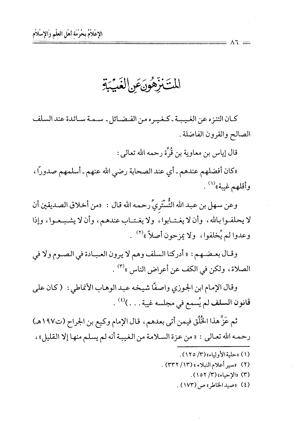 وقال الإمام ابن الجوزي واصفًا شيخه عبد الوهاب الأنماطي: (كان على قانون السلف لم يُسمع في مجلسه غيبة ... ) (¬4).