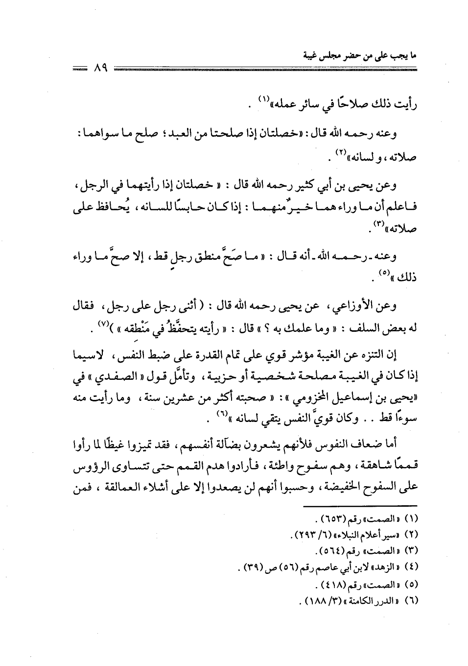 إن التنزه عن الغيبة مؤشر قوي على تمام القدرة على ضبط النفس، لا سيما إذا كان في الغيبة مصلحة شخصية أو حزبية، وتأمَّل قول " الصفدي " في " يحيى بن إسماعيل المخزومي ": " صحبته أكثر من عشرين سنة، وما رأيت منه سوءًا قط .. وكان قويَّ النفس يتقي لسانه " (¬6).