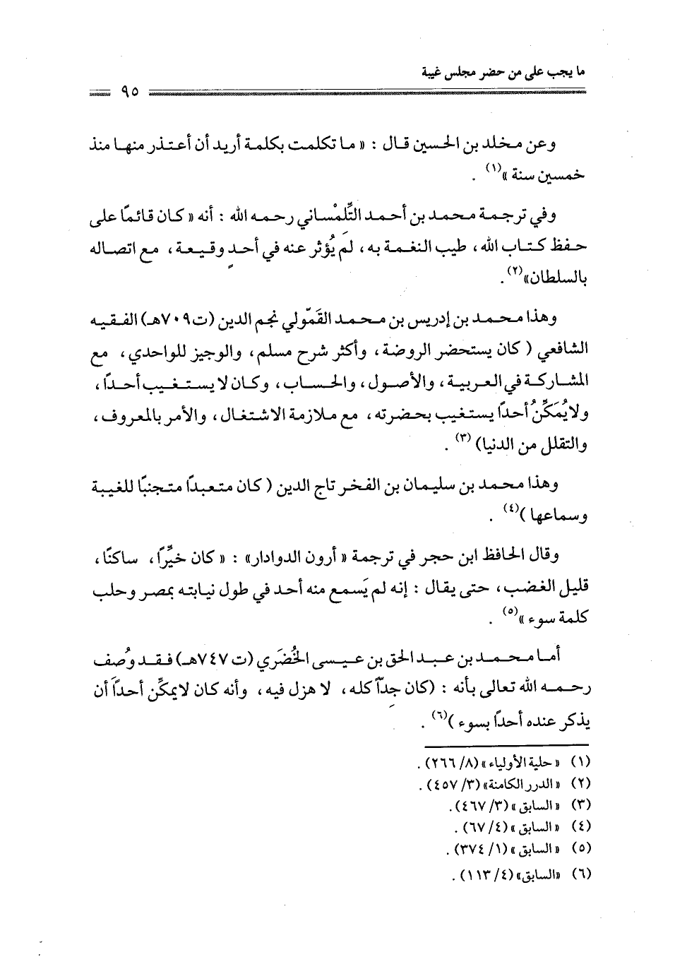 وهذا محمد بن إدريس بن محمد القَمّولي نجم الدين (ت 709 هـ) الفقيه الشافعي (كان يستحضر الروضة، وأكثر شرح مسلم، والوجيز للواحدي، مع المشاركة في العربية، والأصول، والحساب، وكان لا يستغيب أحدًا، ولا يُمَكِّنُ أحدًا يستغيب بحضرته، مع ملازمة الاشتغال، والأمر بالمعروف، والتقلل من الدنيا) (¬3).