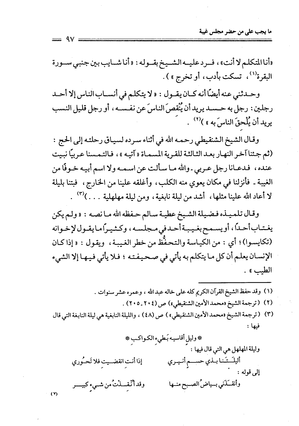وقال الشيخ الشنقيطي رحمه الله في أثناء سرده لسياق رحلته إلى الحج: (ثم جئنا آخر النهار بعد الثالثة للقرية المسماة " آتيه "، فالتمسنا عربيًا نبيت عنده، فدعانا رجل عربي -والله ما سألت عن اسمه ولا اسم أبيه خوفًا من الغيبة- فأنزلنا في مكان يعوي منه الكلب، وأغلقه علينا من الخارج، فبتنا بليلة لا أعاد الله علينا مثلها، أشد من ليلة نابغية، ومن ليلة مهلهلية ..... ) (¬3).