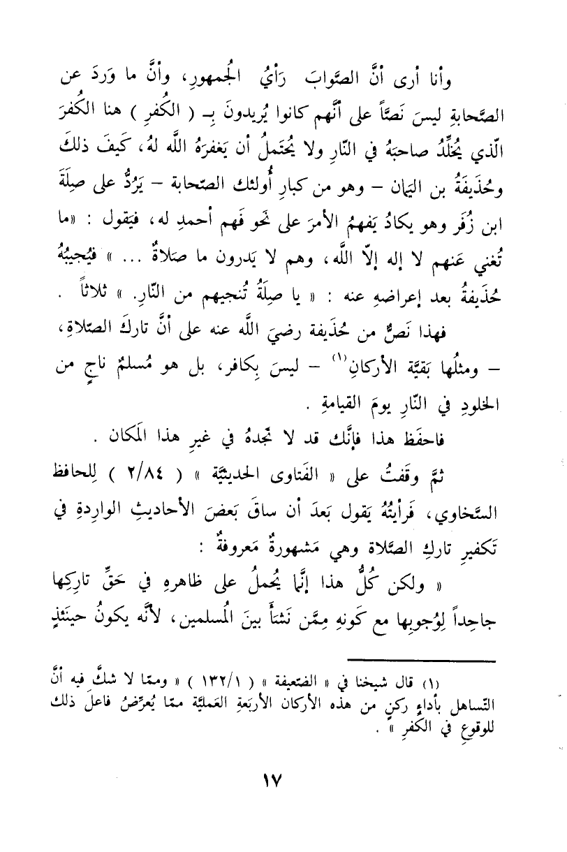وأنا أرى أن الصواب رأي الجمهور وأن ما ورد عن الصحابة ليس نصا على أنهم كانوا يريدون ب (الكفر) هنا الكفر الذي يخلد صاحبه في النار ولا يحتمل أن يغفره الله له كيف ذلك وحذيفة بن اليمان - وهو من كبار أولئك الصحابة - يرد على صلة ابن زفر وهو يكاد يفهم الأمر على نحو فهم أحمد له فيقول: