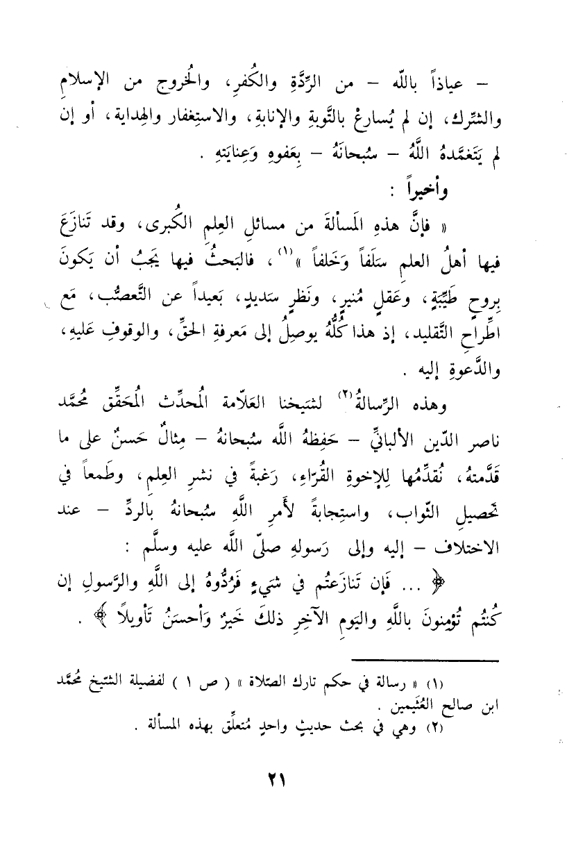 فلا يمنعن أحدا من قارئي هذه الرسالة إلفه أو عادته أو ما نشأ عليه أو تلقنه: من أن يقبل الحق وينصاع إليه ويجاهد دونه إذ الحق أغلى ما يطلب وأعز ما يرغب