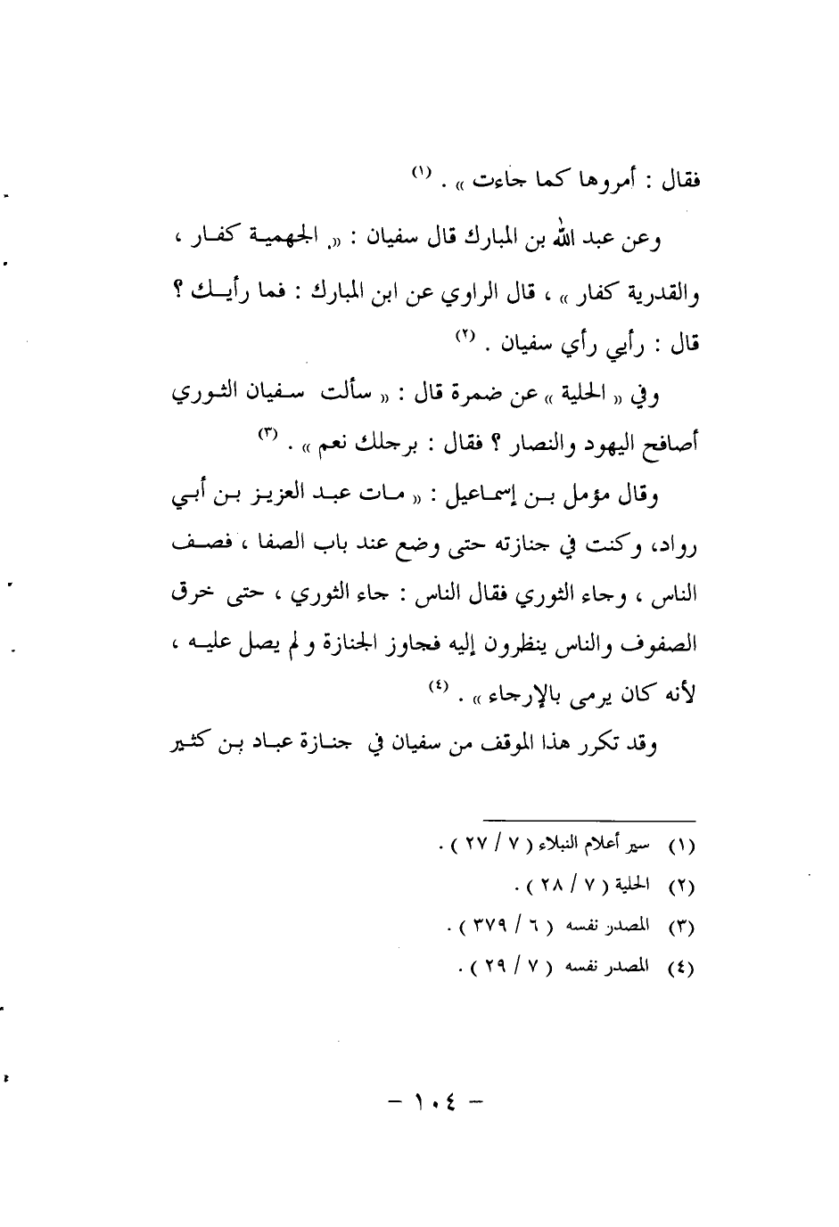 وعن عبد الله بن المبارك قال سفيان: "الجهمية كفار، والقدرية كفار"، قال الراوي عن ابن المبارك: فما رأيك قال: رأيي رأي سفيان. 2