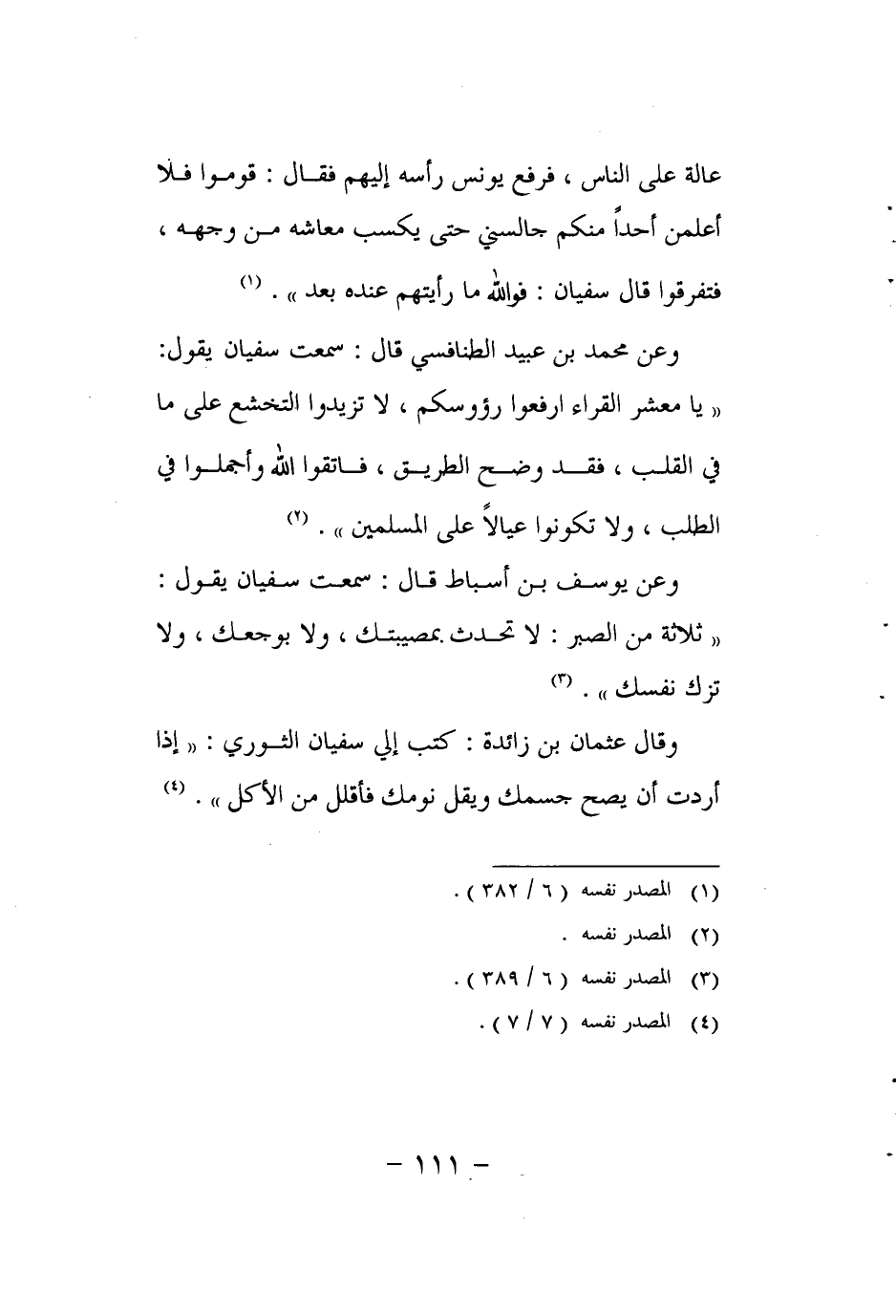 وقال عثمان بن زائدة: كتب إليَّ سفيان الثوري: "إذا أردت أن يصح جسمك ويقل نومك فأقلل من الأكل". 4