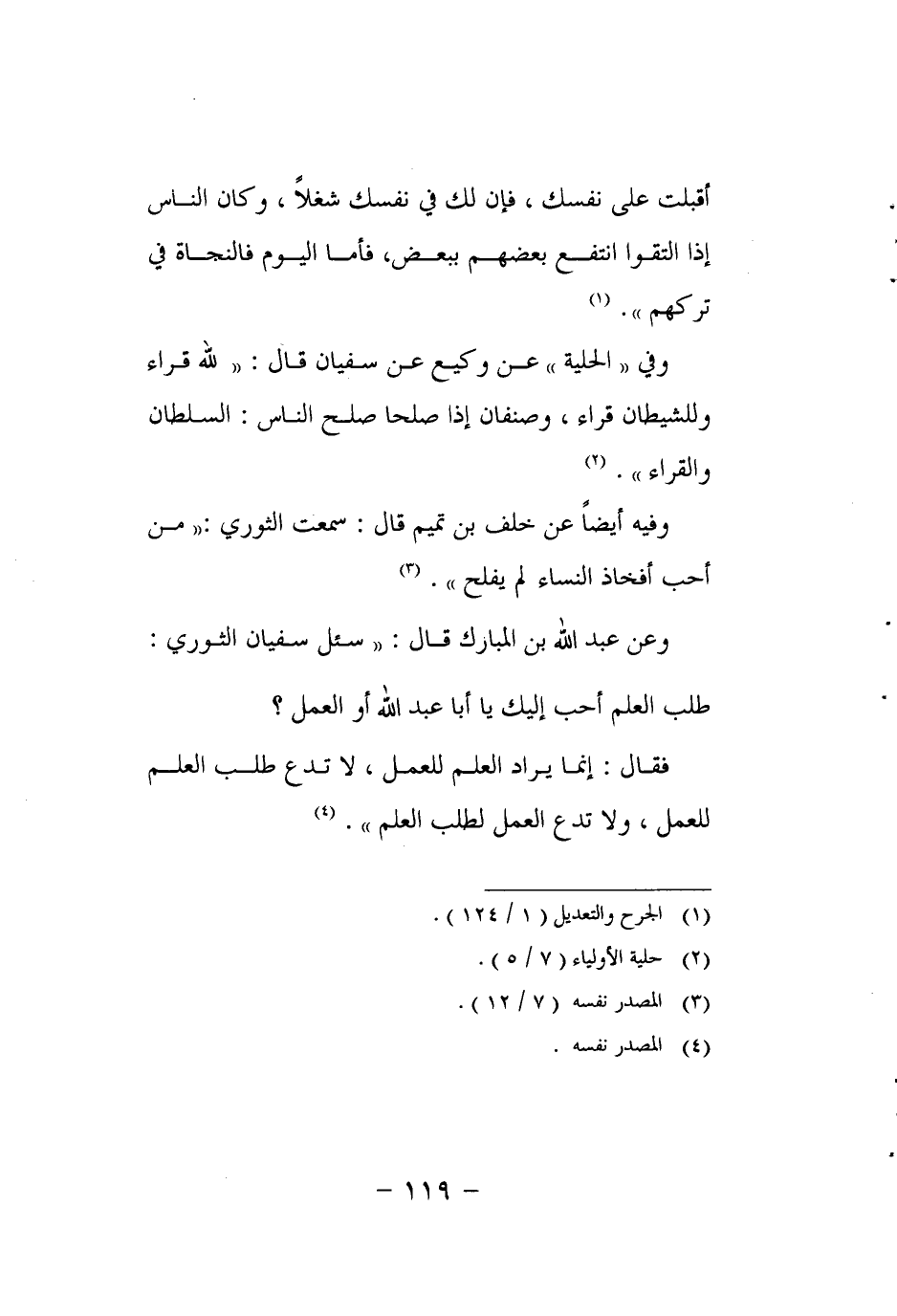 وعن عبد الله بن المبارك قال: "سئل سفيان الثوري: طلب العلم أحب إليك يا أبا عبد الله أو العمل