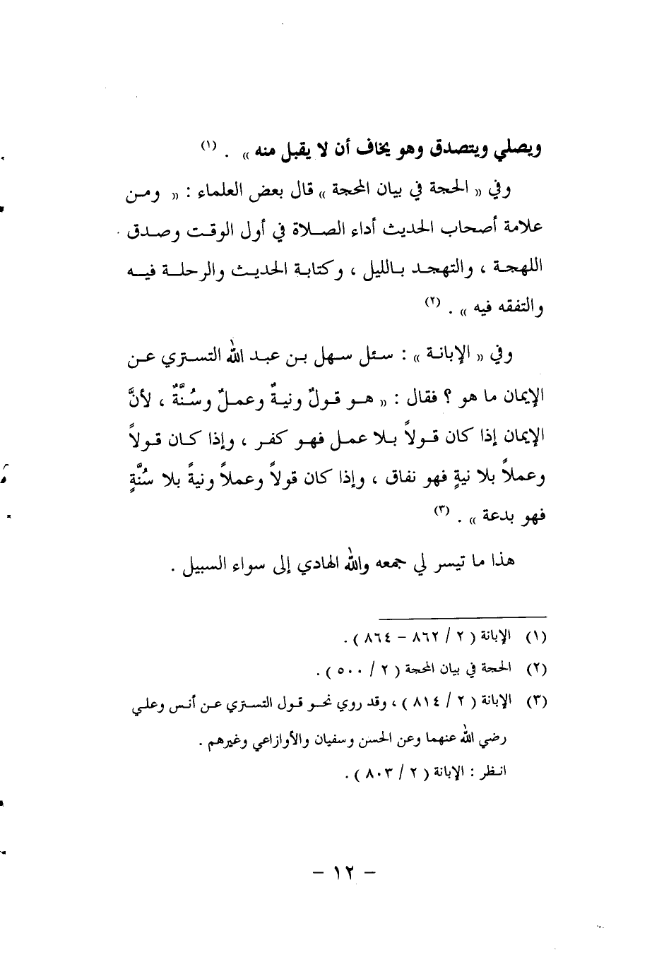 وفي "الحجة في بيان المحجة" قال بعض العلماء: "ومن علامة أصحاب الحديث أداء الصلاة في أول الوقت وصدق اللهجة، والتهجد بالليل، وكتابة الحديث والرحلة فيه والتفقه فيه". 2 وفي "الإبانة": سئل سهل بن عبد الله التستري عن الإيمان ما هو فقال: "هو قولٌ ونيةٌ وعملٌ وسُنَّةٌ، لأنَّ الإيمان إذا كان قولاً بلا عمل فهو كفر، وإذا كان قولاً وعملاً بلا نيةٍ فهو نفاق، وإذا كان قولاً وعملاً ونيةً بلا سُنَّةٍ فهو بدعة". 3