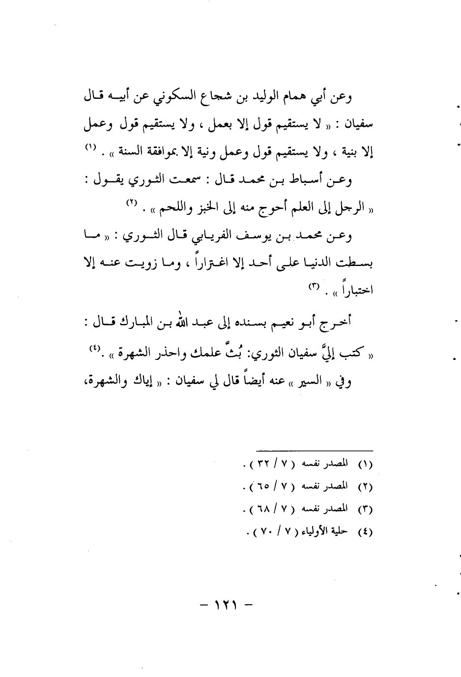 أخرج أبو نعيم بسنده إلى عبد الله بن المبارك قال: "كتب إليَّ سفيان الثوري: بُثَّ علمك واحذر الشهرة". 4
