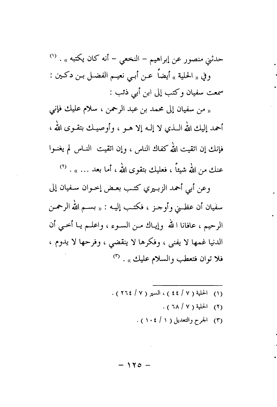"من سفيان إلى محمد بن عبد الرحمن، سلام عليك فإني أحمد إليك الله الذي لا إله إلا هو، وأوصيك بتقوى الله، فإنك إن اتقيت الله كفاك الناس، وإن اتقيت الناس لم يغنوا عنك من الله شيئاً، فعليك بتقوى الله، أما بعد". 2