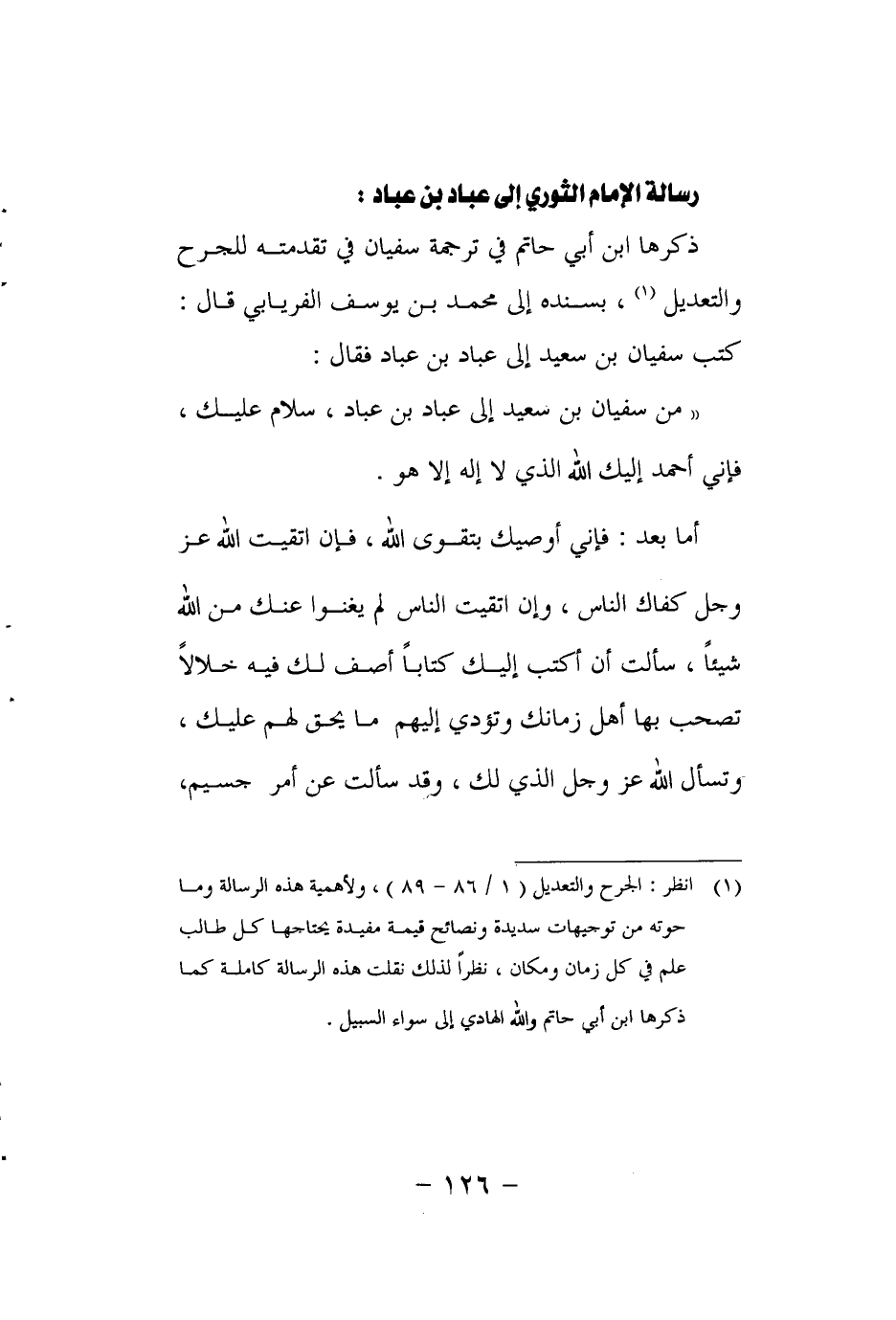 "من سفيان بن سعيد إلى عباد بن عباد، سلام عليك، فإني أحمد إليك الله الذي لا إله إلا هو.