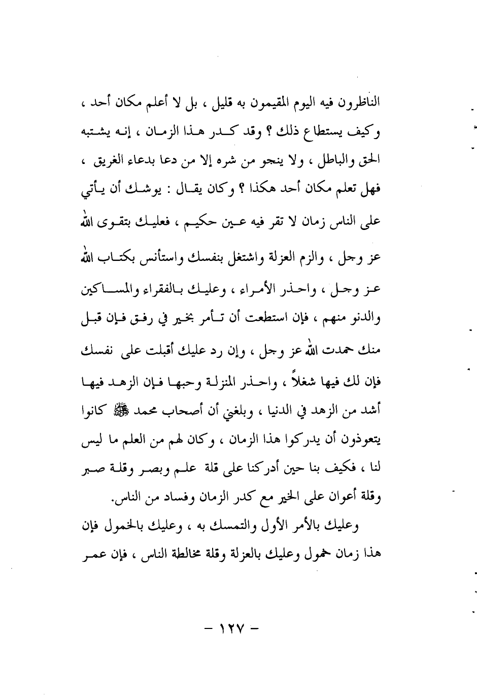 الناظرون فيه اليوم المقيمون به قليل، بل لا أعلم مكان أحد، وكيف يستطاع ذلك وقد كدر هذا الزمان، إنه يشتبه الحق والباطل، ولا ينجو من شره إلا من دعا بدعاء الغريق، فهل تعلم مكان أحد هكذا وكان يقال: يوشك أن يأتي على الناس زمان لا تقر فيه عين حكيم، فعليك بتقوى الله عز وجل، والزم العزلة واشتغل بنفسك واستأنس بكتاب الله عز وجل، واحذر الأمراء، وعليك بالفقراء والمساكين والدنو منهم، فإن استطعت أن تأمر بخير في رفق فإن قبل منك حمدت الله عز وجل، وإن رد عليك أقبلت على نفسك فإن لك فيها شغلاً، واحذر المنزلة وحبها فإن الزهد فيها أشد من الزهد في الدنيا، وبلغني أن أصحاب محمد صلى الله عليه وسلم كانوا يتعوذون أن يدركوا هذا الزمان، وكان لهم من العلم ما ليس لنا، فكيف بنا حين أدركنا على قلة علم وبصر وقلة صبر وقلة أعوان على الخير مع كدر الزمان وفساد من الناس.