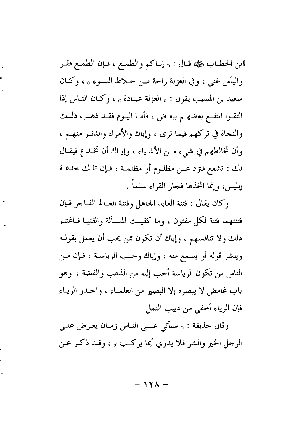 ابن الخطاب رضي الله عنه قال: "إياكم والطمع، فإن الطمع فقر واليأس غنى، وفي العزلة راحة من خلاط السوء"، وكان سعيد بن المسيب يقول: "العزلة عبادة"، وكان الناس إذا التقوا انتفع بعضهم ببعض، فأما اليوم فقد ذهب ذلك والنجاة في تركهم فيما نرى، وإياك والأمراء والدنو منهم، وأن تخالطهم في شيء من الأشياء، وإياك أن تخدع فيقال لك: تشفع فترد عن مظلوم أو مظلمة، فإن تلك خدعة إبليس، وإنما اتخذها فجار القراء سلماً.