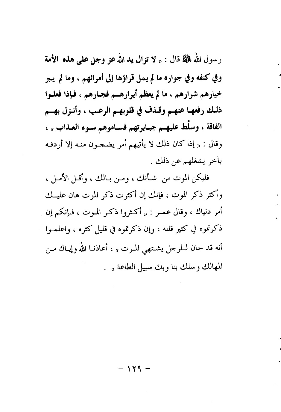 فليكن الموت من شأنك، ومن بالك، وأَقِلَّ الأمل، وأكثر ذكر الموت، فإنك إن أكثرت ذكر الموت هان عليك أمر دنياك، وقال عمر: "أكثروا ذكر الموت، فإنكم إن ذكرتموه في كثير قلله، وإن ذكرتموه في قليل كثره، واعلموا أنه قد حان للرجل يشتهي الموت"، أعاذنا الله وإياك من المهالك وسلك بنا وبك سبيل الطاعة".