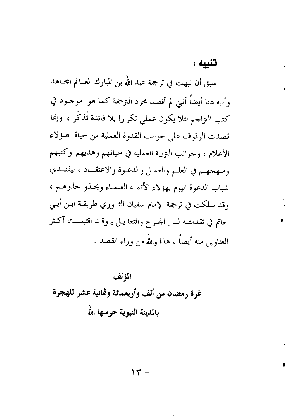 سبق أن نبهت في ترجمة عبد الله بن المبارك العالم المجاهد وأنبه هنا أيضاً أنني لم أقصد مجرد الترجمة كما هو موجود في كتب التراجم لئلا يكون عملي تكراراً بلا فائدة تُذكَر، وإنما قصدت الوقوف على جوانب القدوة العملية من حياة هؤلاء الأعلام، وجوانب التربية العملية في حياتهم وهديهم وكتبهم ومنهجهم في العلم والعمل والدعوة والاعتقاد، ليقتدي شباب الدعوة اليوم بهؤلاء الأئمة العلماء ويحذو حذوهم، وقد سلكت في ترجمة الإمام سفيان الثوري طريقة ابن أبي حاتم في تقدمته لـ "الجرح والتعديل" وقد اقتبست أكثر العناوين منه أيضاً، هذا والله من وراء القصد.