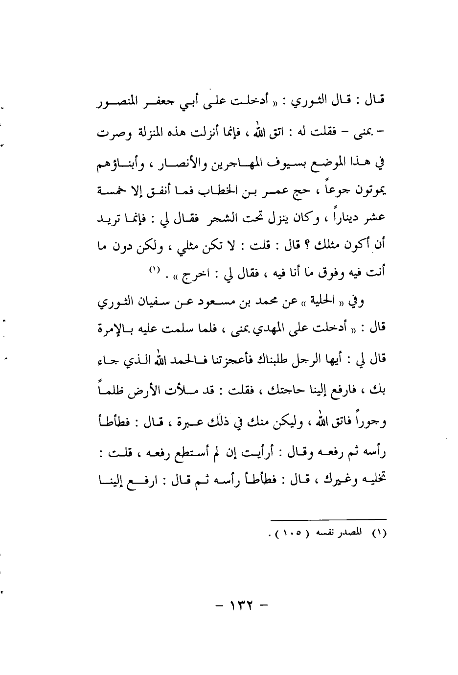 وفي "الحلية "عن محمد بن مسعود عن سفيان الثوري قال: " ادخلت على المهدي بمنى، فلما سلمت عليه بالإمرة قال لي: أيها الرجل طلبناك فأعجزتنا فالحمد الله الذي جاء بك فارفع إلينا حاجتك، فقلت: قد ملأت الأرض ظلما وجورا فاتق الله، وليكن منك في ذلك عبرة، قال: فطأطا رأسه ثم رفعه وقال: أرأيت إن لم أستطع رفعه، قلت: تخليه وغيرك، قال: فطأطا رأسه ثم قال: ارفع إلينا