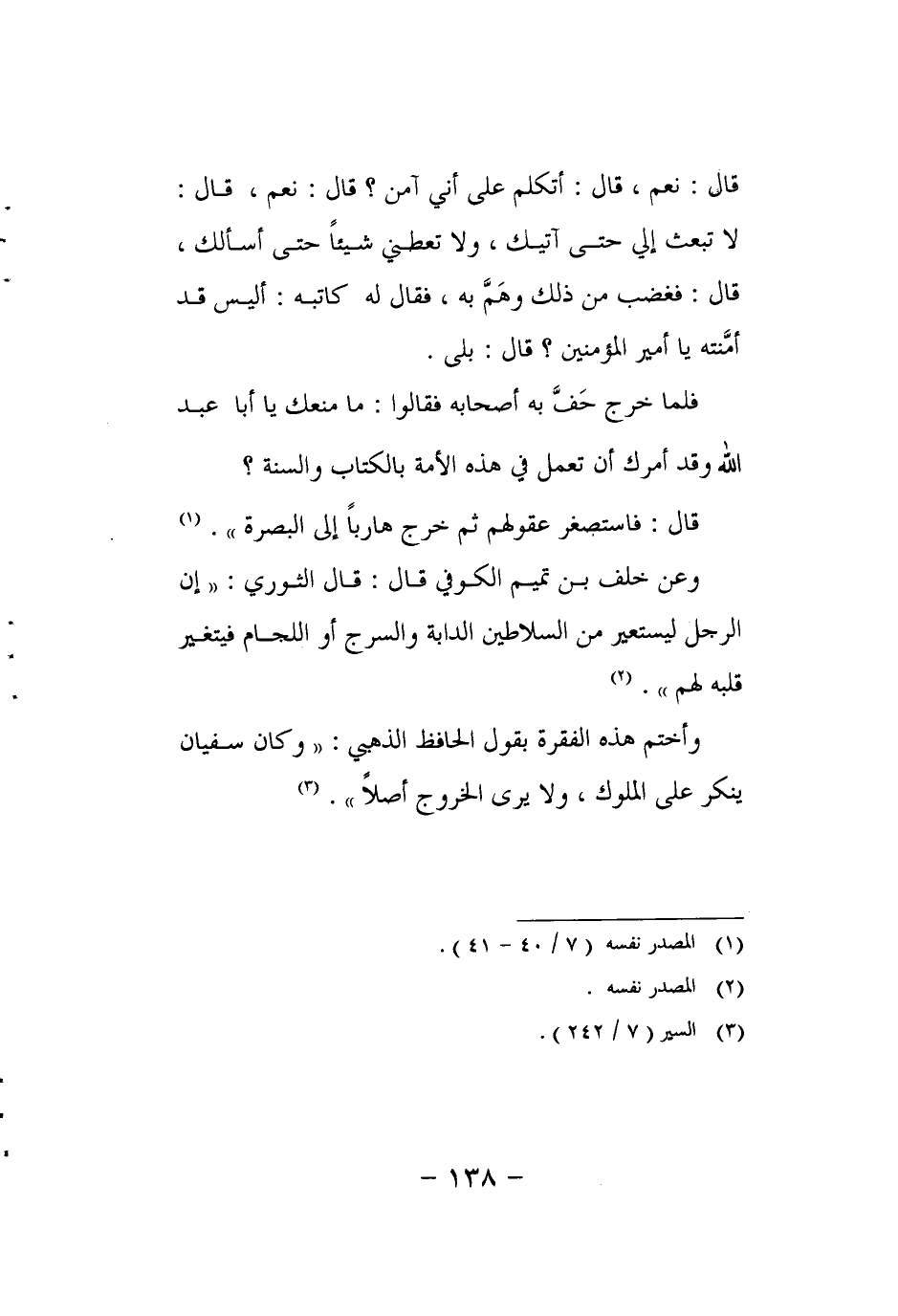 وأختم هذه الفقرة بقول الحافظ الذهبي: وكان سفيان ينكر على الملوك، ولا يرى الخروج أصلا.