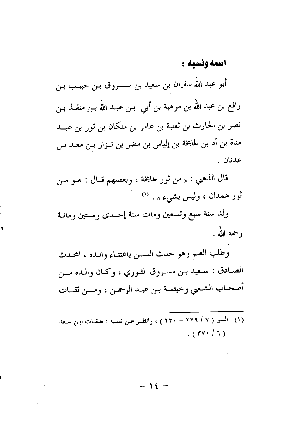 أبو عبد الله سفيان بن سعيد بن مسروق بن حبيب بن رافع بن عبد الله بن موهبة بن أبي بن عبد الله بن منقذ بن نصر بن الحارث بن ثعلبة بن عامر بن ملكان بن ثور بن عبد مناة بن أد بن طابخة بن إلياس بن مضر بن نزار بن معد بن عدنان.