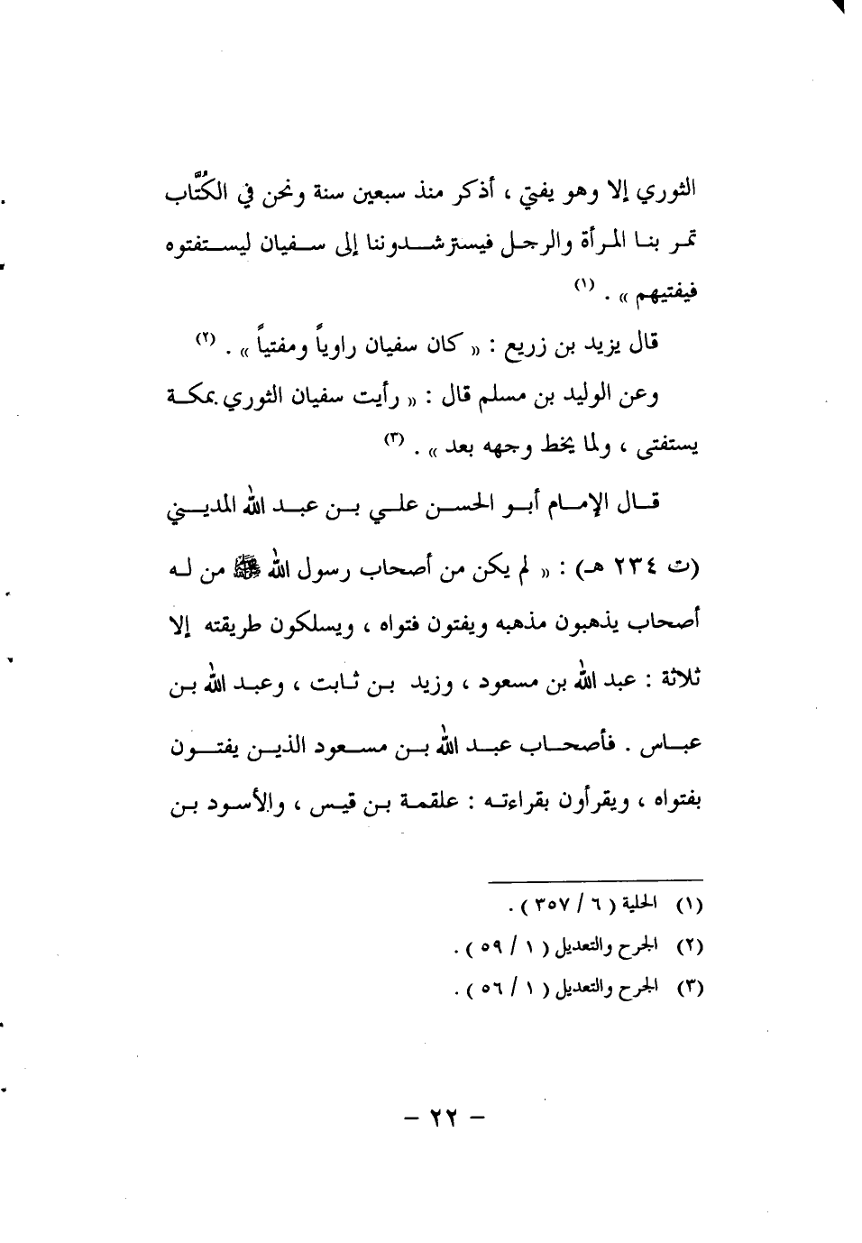 الثوري إلا وهو يفتي، أذكر منذ سبعين سنة ونحن في الكُتَّاب تمر بنا المرأة والرجل فيسترشدوننا إلى سفيان ليستفتوه فيفتيهم". 1