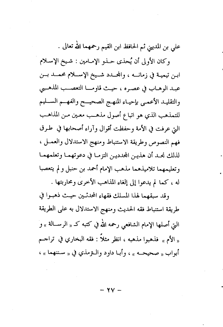 وكان الأولى أن يُحذى حذو الإمامين: شيخ الإسلام ابن تيمية في زمانه، والمجدد شيخ الإسلام محمد بن عبد الوهاب في عصره، حيث قاوما التعصب المذهبي والتقليد الأعمى بإحياء المنهج الصحيح والفهم السليم للتمذهب الذي هو اتباع أصول مذهب معين من المذاهب التي عرفت في الأمة وحفظت أقوال وآراء أصحابها في طرق فهم النصوص وطريقة الاستنباط ومنهج الاستدلال والعمل، لذلك نجد أن هذين المجددين التزما في دعوتهما وتعلمهما وتعليمهما تلاميذهما مذهب الإمام أحمد بن حنبل ولم يتعصبا له، كما لم يدعوا إلى إلغاء المذاهب الأخرى ومحاربتها.