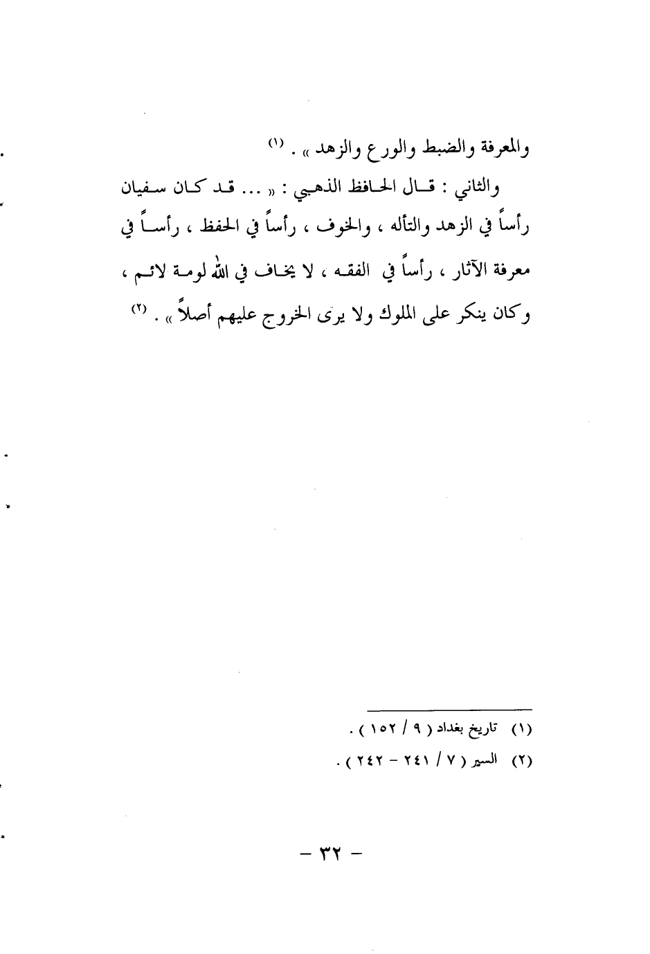 والثاني: قال الحافظ الذهبي: "قد كان سفيان رأساً في الزهد والتأله، والخوف، رأساً في الحفظ، رأساً في معرفة الآثار، رأساً في الفقه، لا يخاف في الله لومة لائم، وكان ينكر على الملوك ولا يرى الخروج عليهم أصلاً". 2