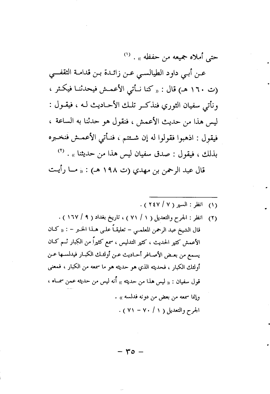 عن أبي داود الطيالسي عن زائدة بن قدامة الثقفي (ت 160 هـ) قال: "كنا نأتي الأعمش فيحدثنا فيكثر، ونأتي سفيان الثوري فنذكر تلك الأحاديث له، فيقول: ليس هذا من حديث الأعمش، فنقول هو حدثنا به الساعة، فيقول: اذهبوا فقولوا له إن شئتم، فنأتي الأعمش فنخبره بذلك، فيقول: صدق سفيان ليس هذا من حديثنا". 2