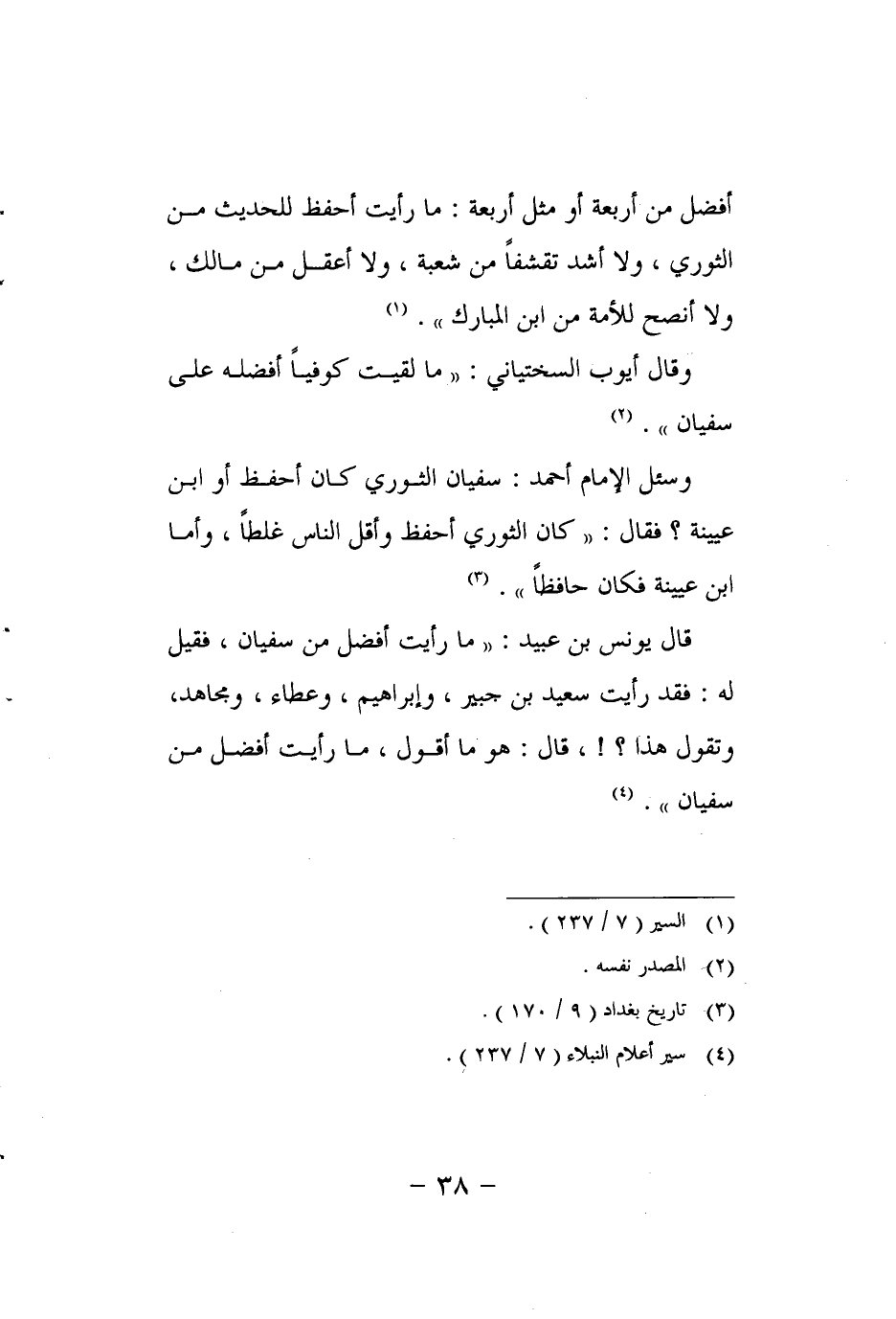 وسئل الإمام أحمد: سفيان الثوري كان أحفظ أو ابن عيينة؟ فقال: "كان الثوري أحفظ وأقل الناس غلطاً، وأما ابن عيينة فكان حافظاً". 3