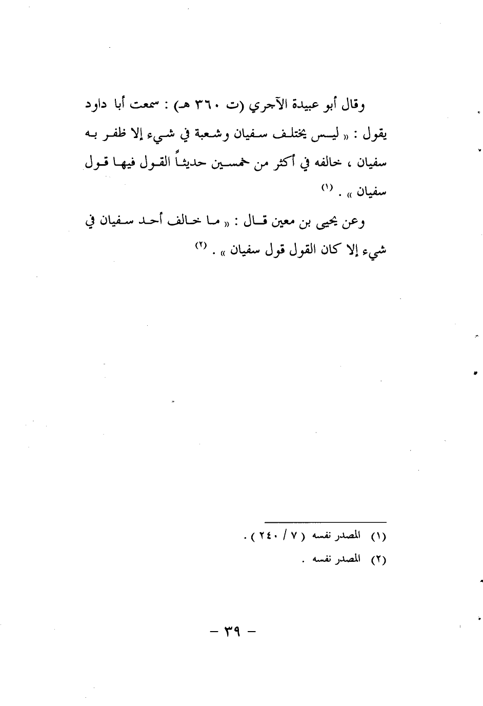 وقال أبو عبيدة الآجري (ت 360 هـ): سمعت أبا داود يقول: "ليس يختلف سفيان وشعبة في شيء إلا ظفر به سفيان، خالفه في أكثر من خمسين حديثاً القول فيها قول سفيان". 1