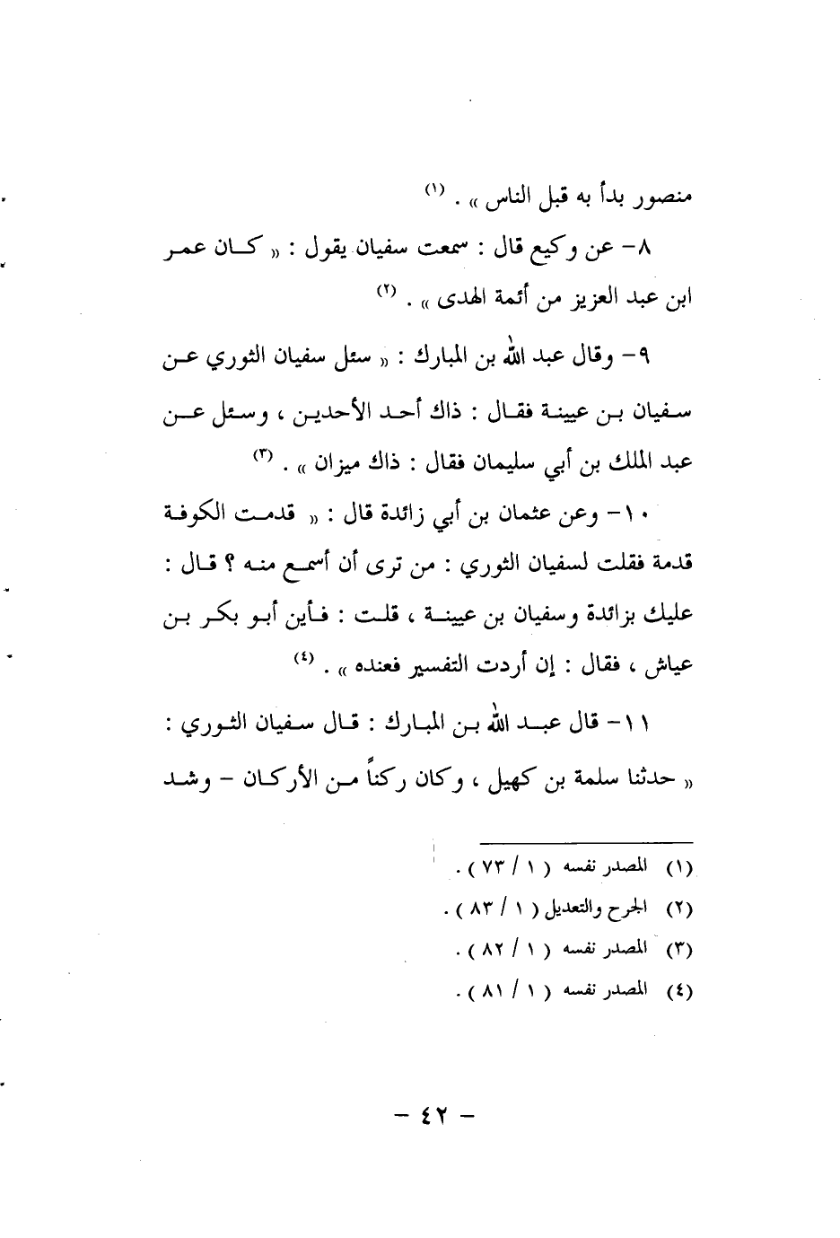 9 - وقال عبد الله بن المبارك: "سئل سفيان الثوري عن سفيان بن عيينة فقال: ذاك أحد الأحدين، وسئل عن عبد الملك بن أبي سليمان فقال: ذاك ميزان". 3