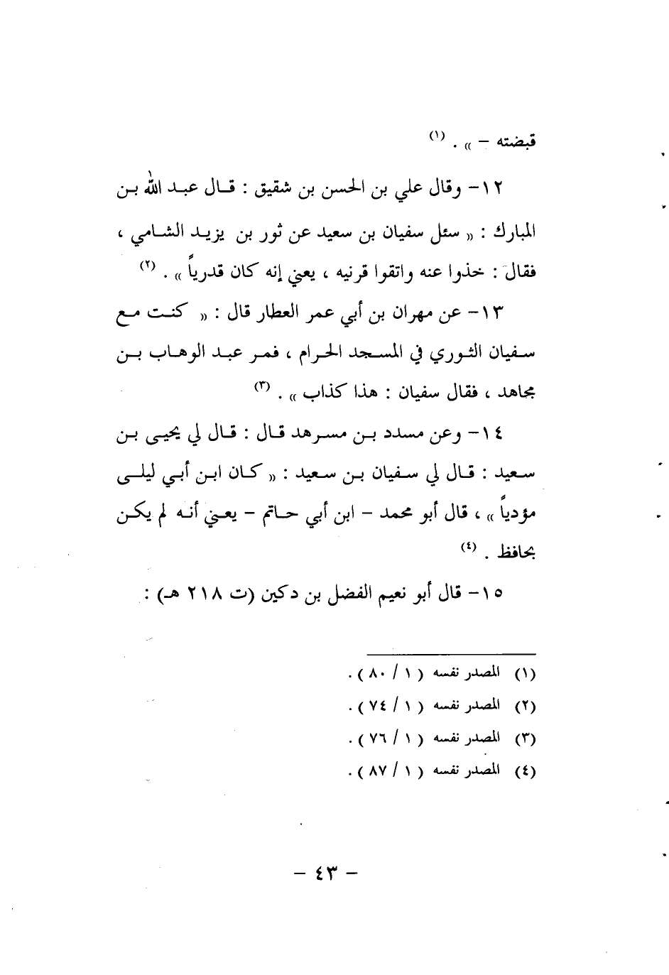 12 - وقال علي بن الحسن بن شقيق: قال عبد الله بن المبارك: "سئل سفيان بن سعيد عن ثور بن يزيد الشامي، فقال: خذوا عنه واتقوا قرنيه، يعني إنه كان قدرياً". 2