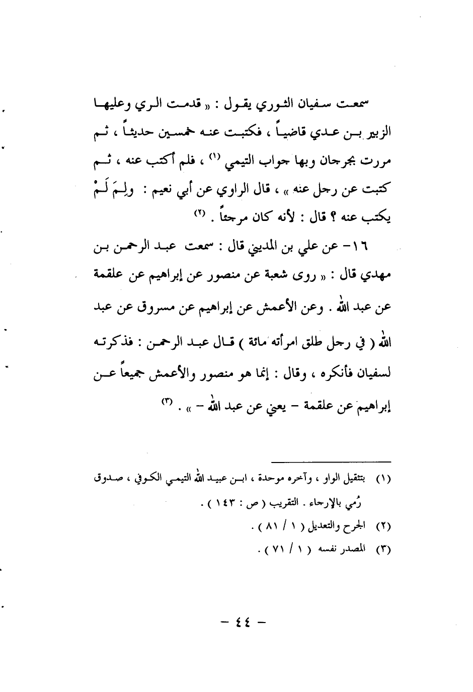 16 - عن علي بن المديني قال: سمعت عبد الرحمن بن مهدي قال: "روى شعبة عن منصور عن إبراهيم عن علقمة عن عبد الله. وعن الأعمش عن إبراهيم عن مسروق عن عبد الله (في رجل طلق امرأته مائة) قال عبد الرحمن: فذكرته لسفيان فأنكره، وقال: إنما هو منصور والأعمش جميعاً عن إبراهيم عن علقمة - يعني عن عبد الله -". 3