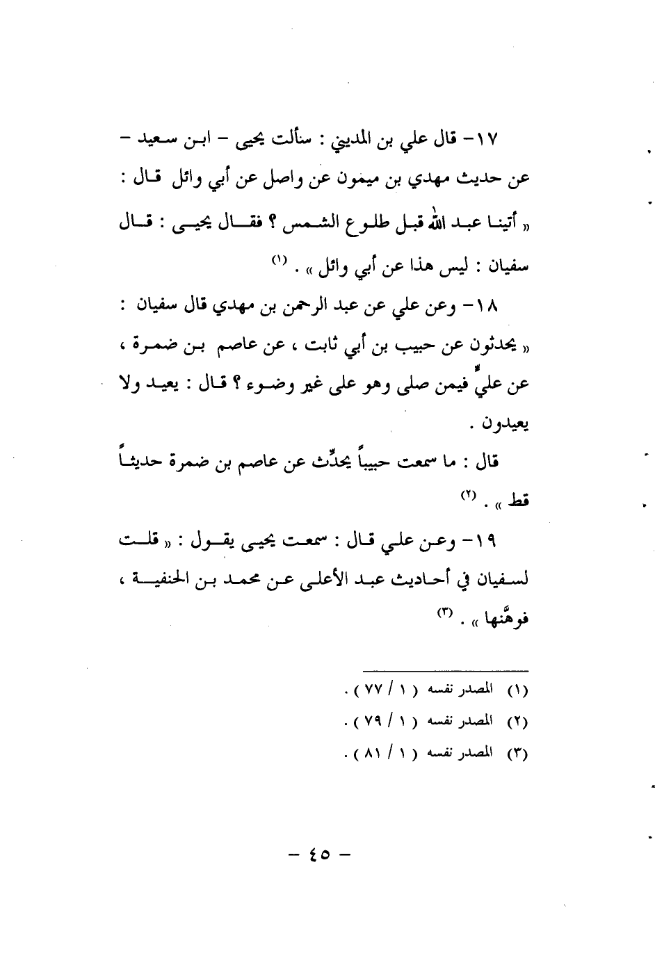 17 - قال علي بن المديني: سألت يحيى - ابن سعيد - عن حديث مهدي بن ميمون عن واصل عن أبي وائل قال: "أتينا عبد الله قبل طلوع الشمس فقال يحيى: قال سفيان: ليس هذا عن أبي وائل". 1
