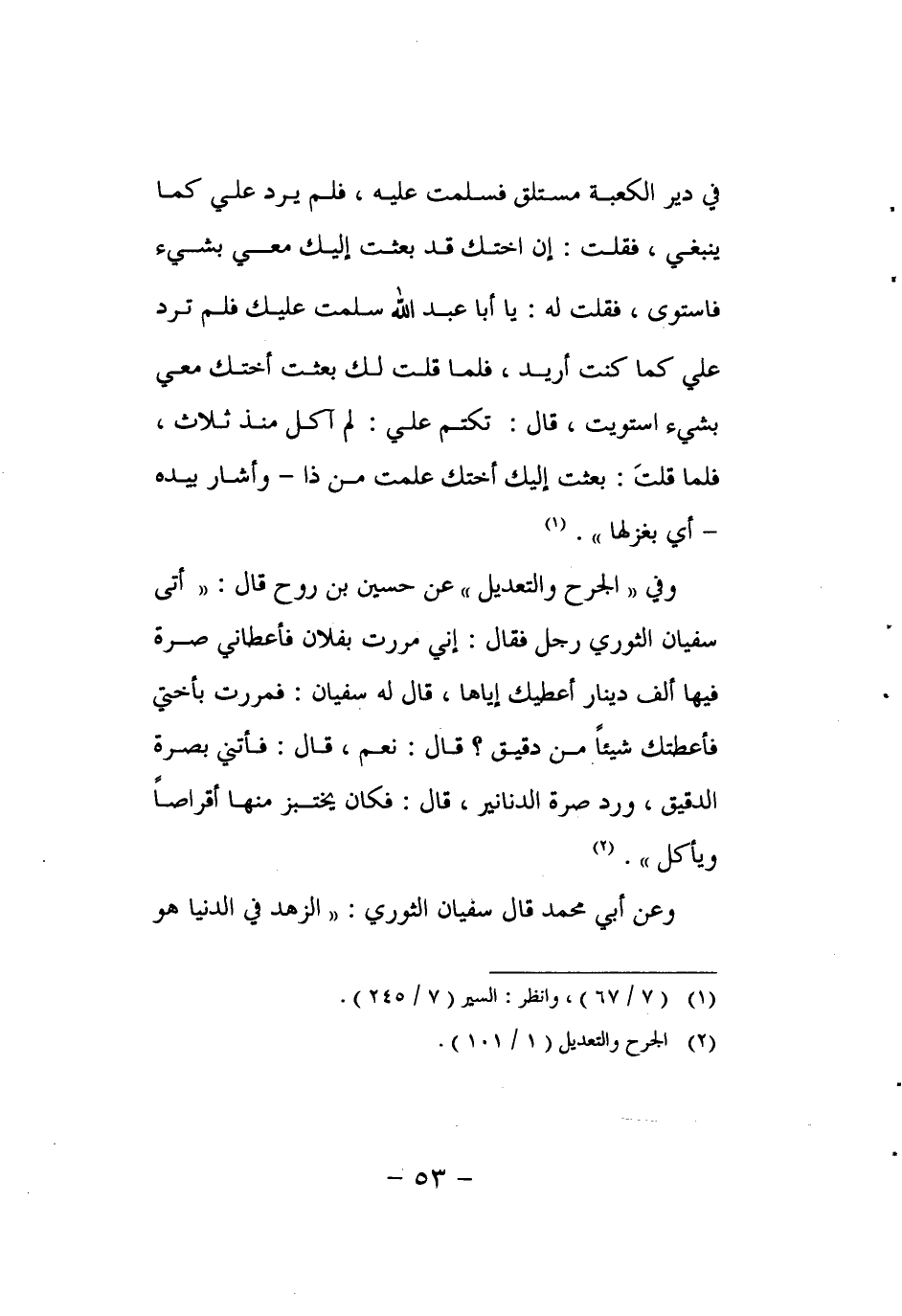 وفي "الجرح والتعديل" عن حسين بن روح قال: "أتى سفيان الثوري رجل فقال: إني مررت بفلان فأعطاني صرة فيها ألف دينار أعطيك إياها، قال له سفيان: فمررت بأختي فأعطتك شيئاً من دقيق؟ قال: نعم، قال: فأتني بصرة الدقيق، ورد صرة الدنانير، قال: فكان يختبز منها أقراصاً ويأكل". 2