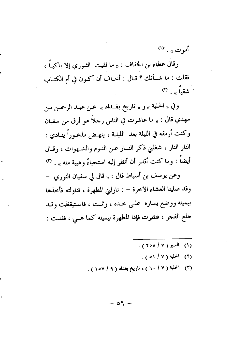 وفي "الحلية" و "تاريخ بغداد" عن عبد الرحمن بن مهدي قال: "ما عاشرت في الناس رجلاً هو أرق من سفيان وكنت أرمقه في الليلة بعد الليلة، ينهض مذعوراً ينادي: النار النار، شغلني ذكر النار عن النوم والشهوات، وقال أيضاً: وما كنت أقدر أن أنظر إليه استحياءً وهيبة منه". 3