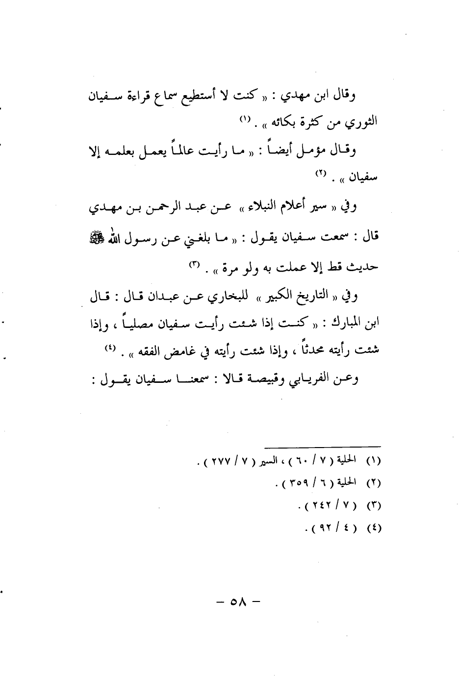 وفي "سير أعلام النبلاء" عن عبد الرحمن بن مهدي قال: سمعت سفيان يقول: "ما بلغني عن رسول الله صلى الله عليه وسلم حديث قط إلا عملت به ولو مرة". 3