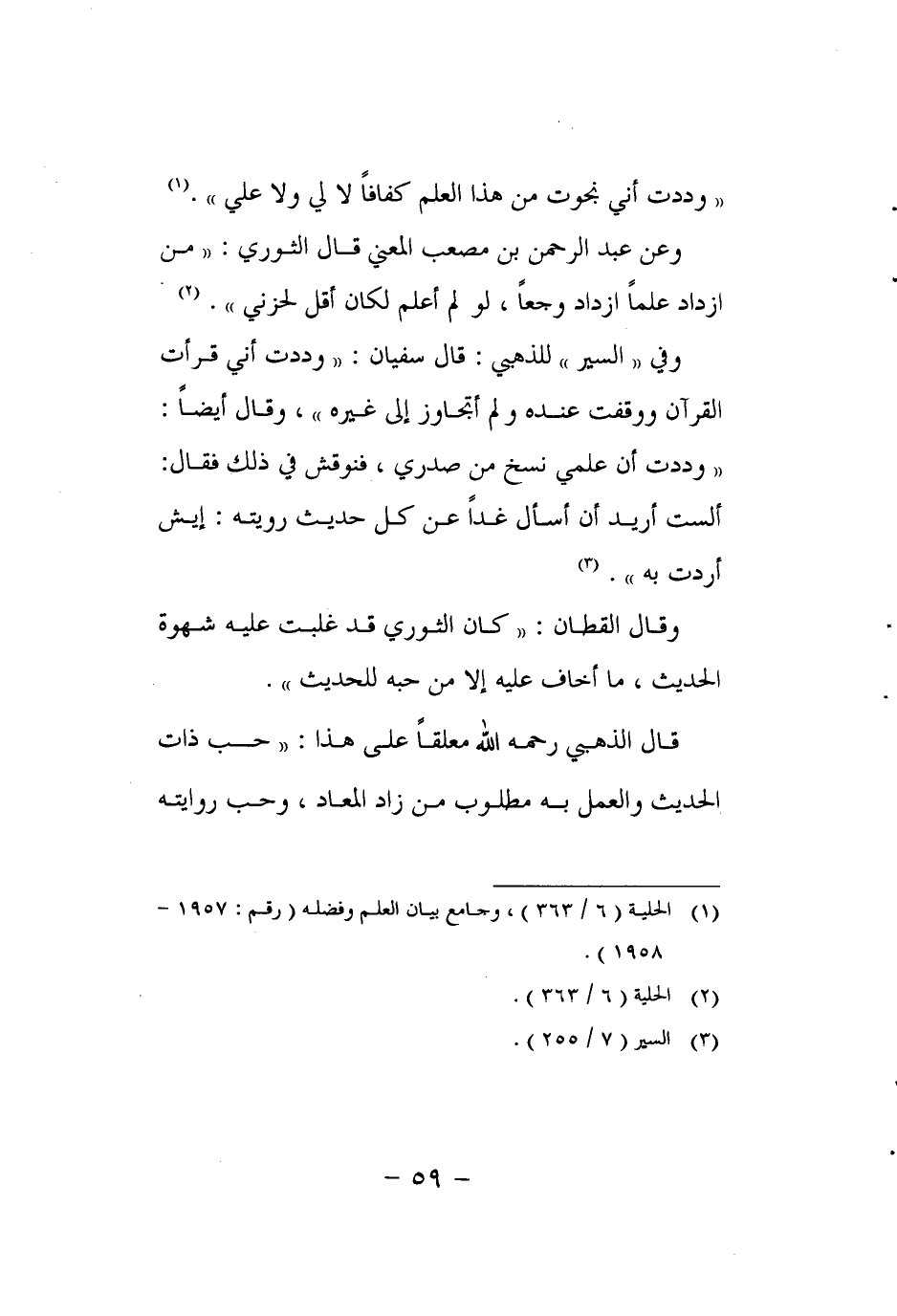 وفي "السير" للذهبي: قال سفيان: "وددت أني قرأت القرآن ووقفت عنده ولم أتجاوز إلى غيره"، وقال أيضاً: "وددت أن علمي نسخ من صدري، فنوقش في ذلك فقال: ألست أريد أن أسأل غداً عن كل حديث رويته: إيش أردت به". 3