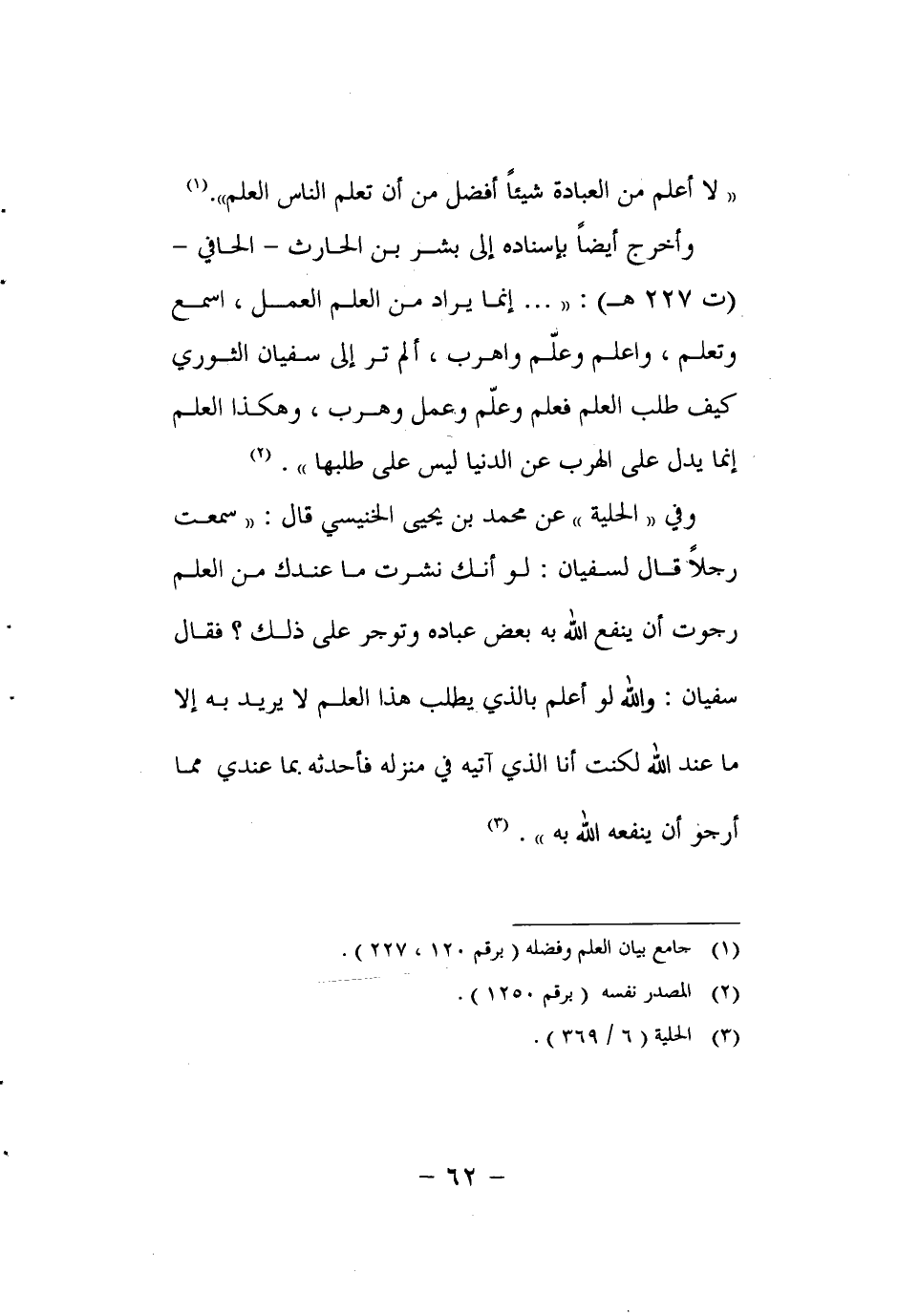 وأخرج أيضاً بإسناده إلى بشر بن الحارث - الحافي - (ت 227 هـ): "إنما يراد من العلم العمل، اسمع وتعلم، واعلم وعلّم واهرب، ألم تر إلى سفيان الثوري كيف طلب العلم فعلم وعلّم وعمل وهرب، وهكذا العلم إنما يدل على الهرب عن الدنيا ليس على طلبها". 2