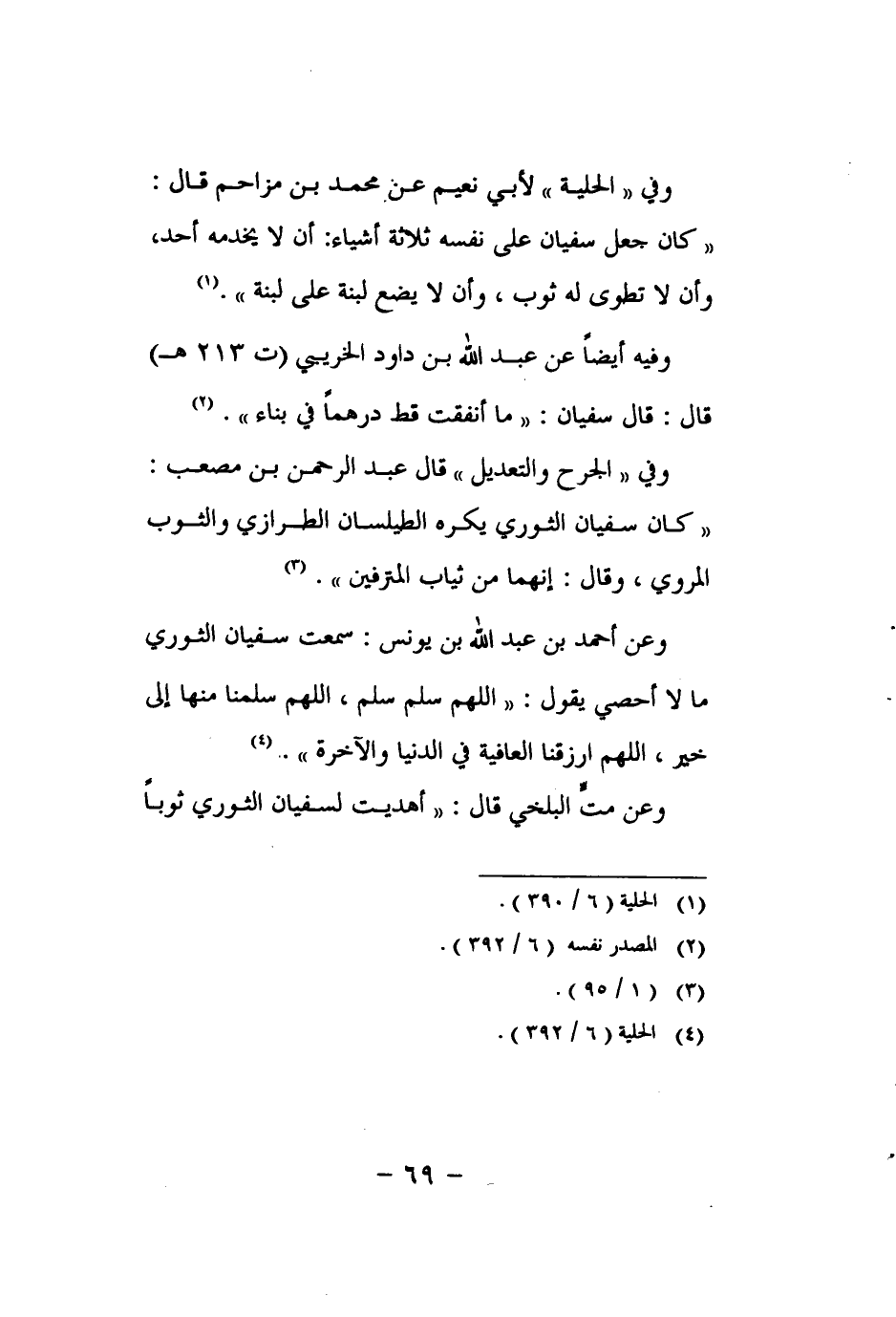 وفي "الحلية" لأبي نعيم عن محمد بن مزاحم قال: "كان جعل سفيان على نفسه ثلاثة أشياء: أن لا يخدمه أحد، وأن لا تطوى له ثوب، وأن لا يضع لبنة على لبنة". 1