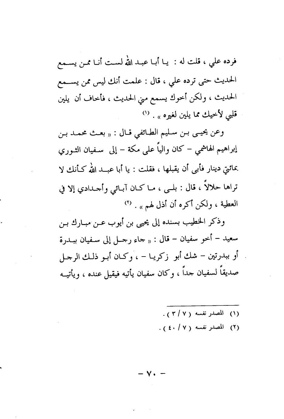 وعن يحيى بن سليم الطائفي قال: "بعث محمد بن إبراهيم الهاشمي - كان والياً على مكة - إلى سفيان الثوري بمائتي دينار فأبى أن يقبلها، فقلت: يا أبا عبد الله كأنك لا تراها حلالاً، قال: بلى، ما كان آبائي وأجدادي إلا في العطية، ولكن أكره أن أذل لهم"2