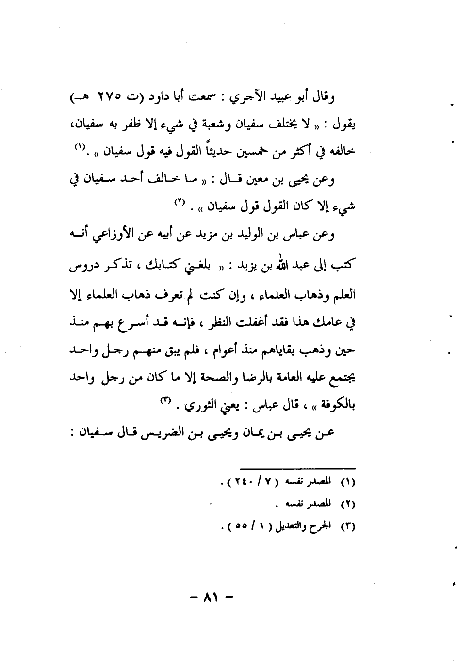 وعن عباس بن الوليد بن مزيد عن أبيه عن الأوزاعي أنه كتب إلى عبد الله بن يزيد: "بلغني كتابك، تذكر دروس العلم وذهاب العلماء، وإن كنت لم تعرف ذهاب العلماء إلا في عامك هذا فقد أغفلت النظر، فإنه قد أسرع بهم منذ حين وذهب بقاياهم منذ أعوام، فلم يبق منهم رجل واحد يجتمع عليه العامة بالرضا والصحة إلا ما كان من رجل واحد بالكوفة"، قال عباس: يعني الثوري. 3